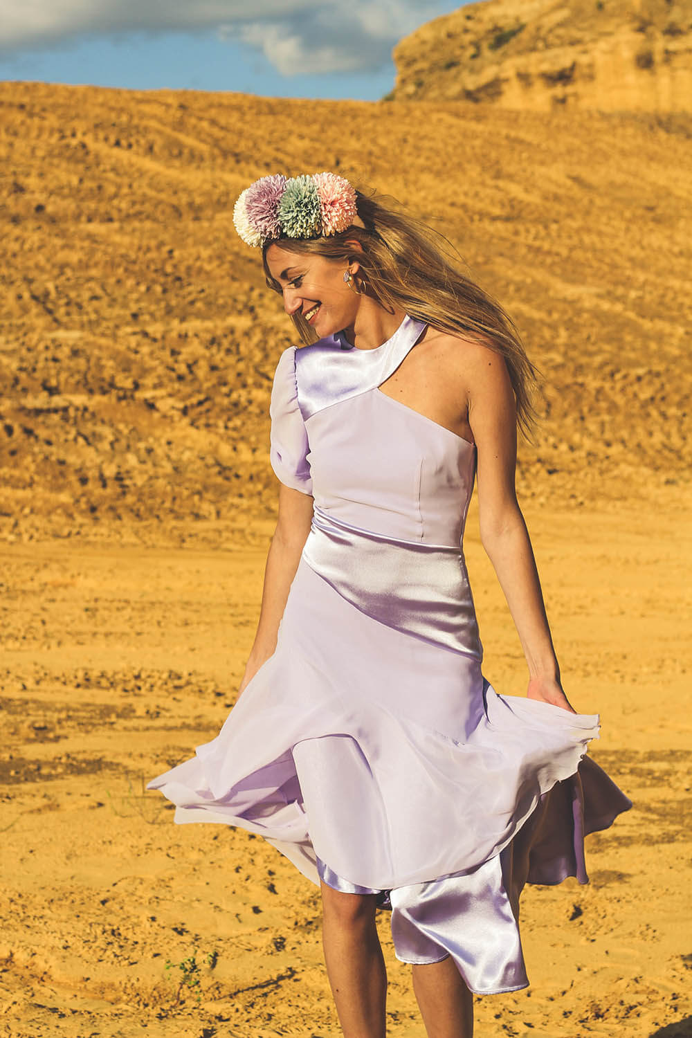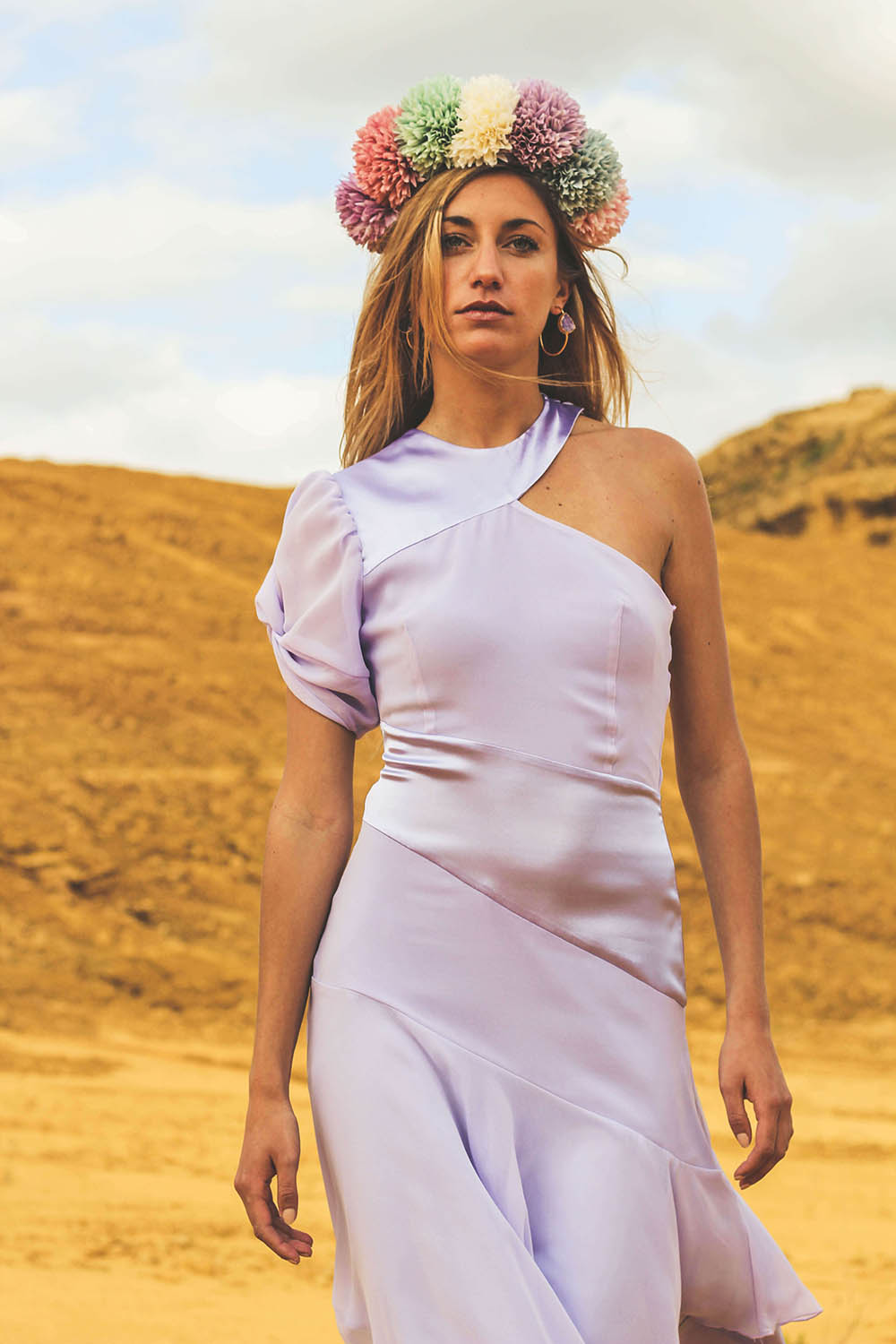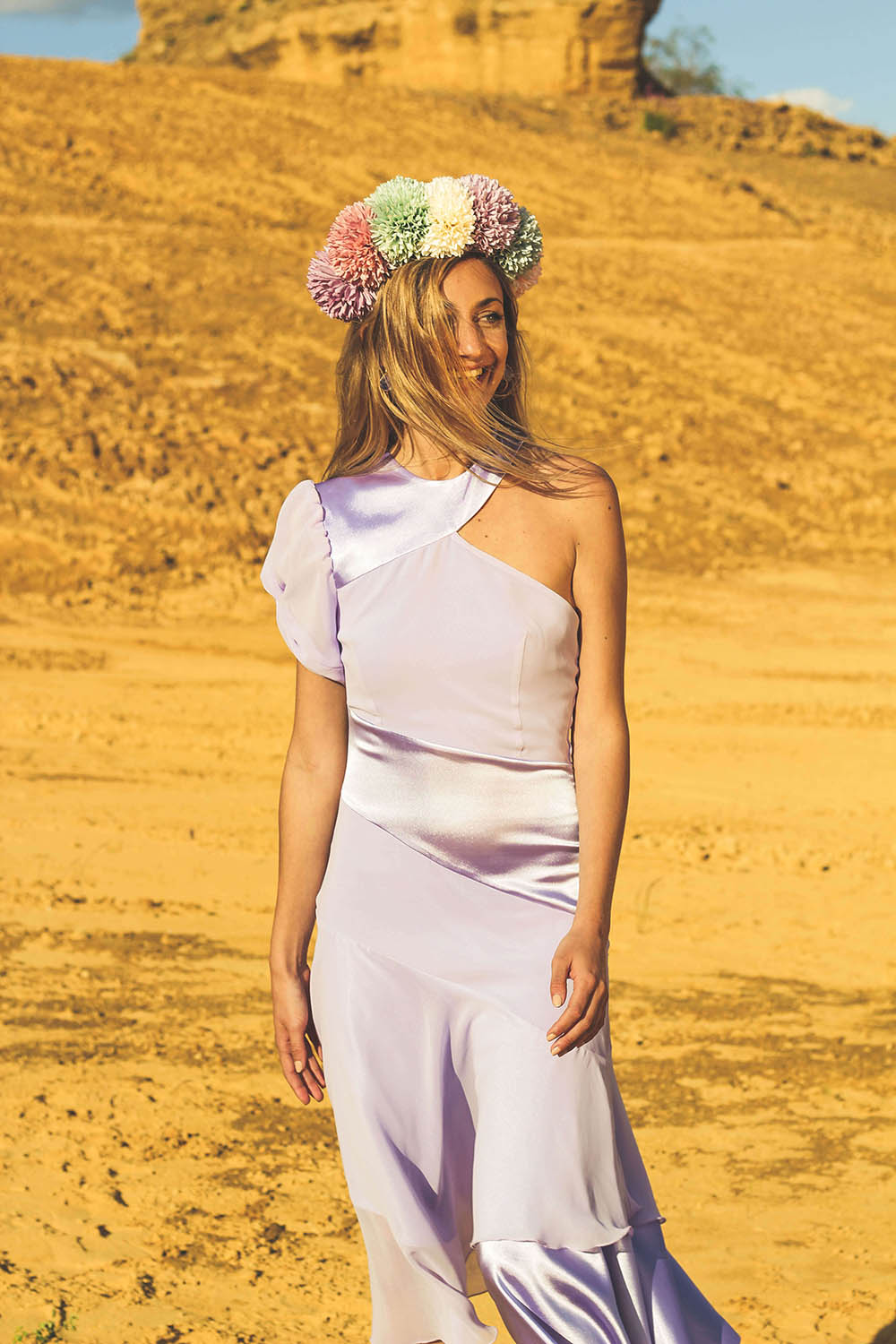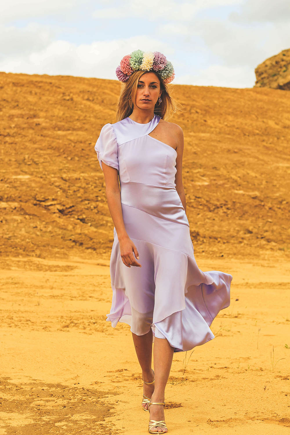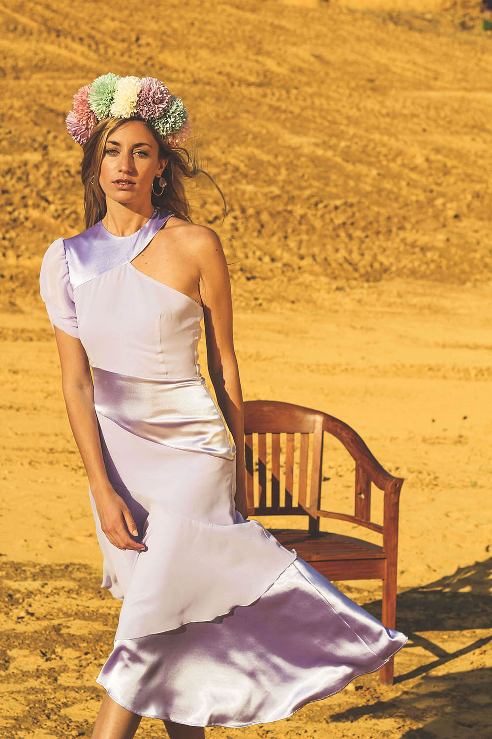 - Vestido largo midi confeccionado en crêpe satén y gasa.