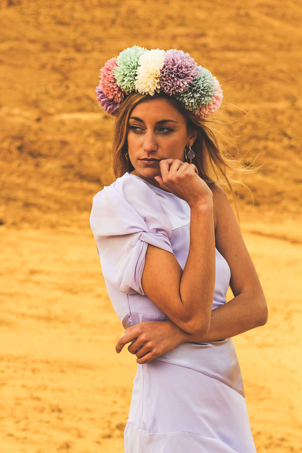 - Manga derecha estilo farol con nudo y hombro izquierdo al aire.