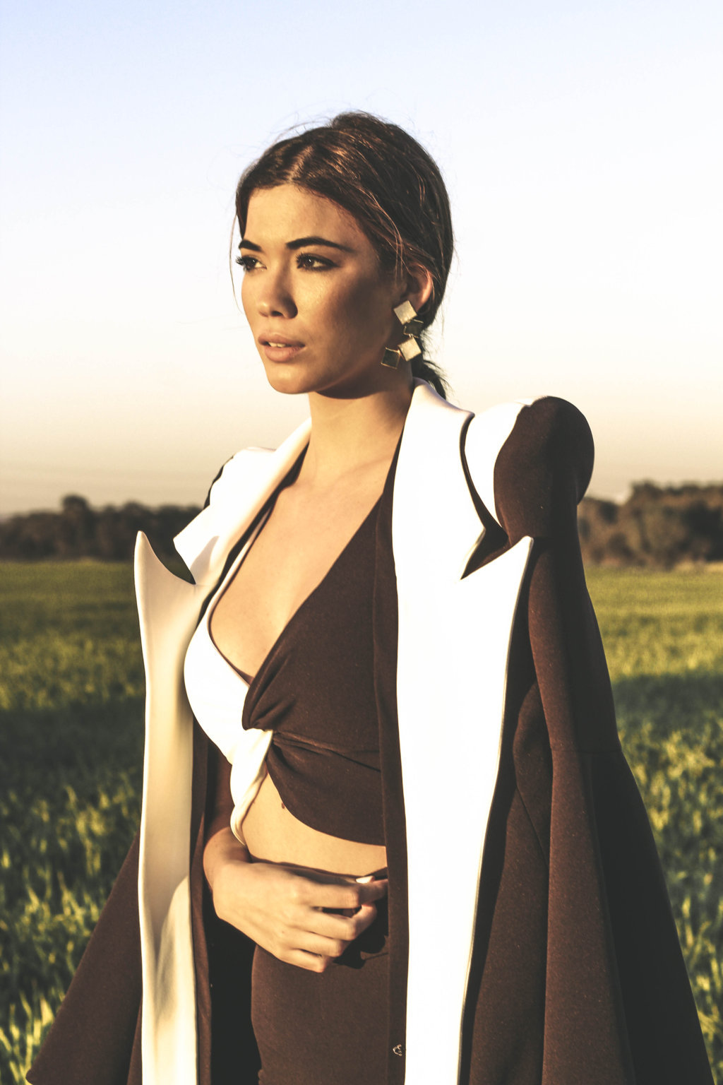 Chaqueta con peplum confeccionada en crêpe elástico. Escote cruzado con mangas abullonada. Contraste en delantero y trasero. Lleva incluido cinturón con hebilla cuadrada.