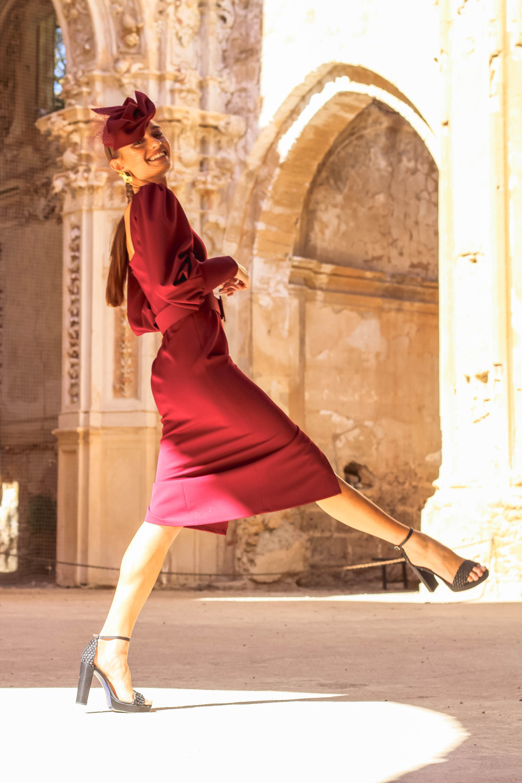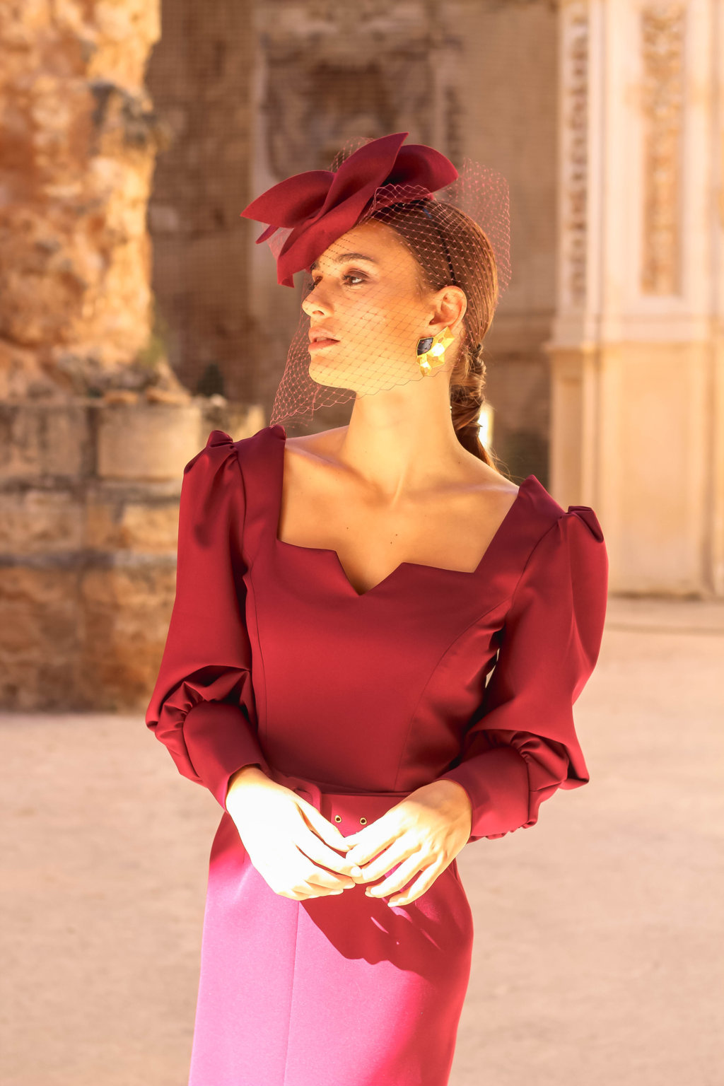 Vestido midi con mangas bishop confeccionado en crêpe elástico. Escote delantero cuadrado con abertura en V.