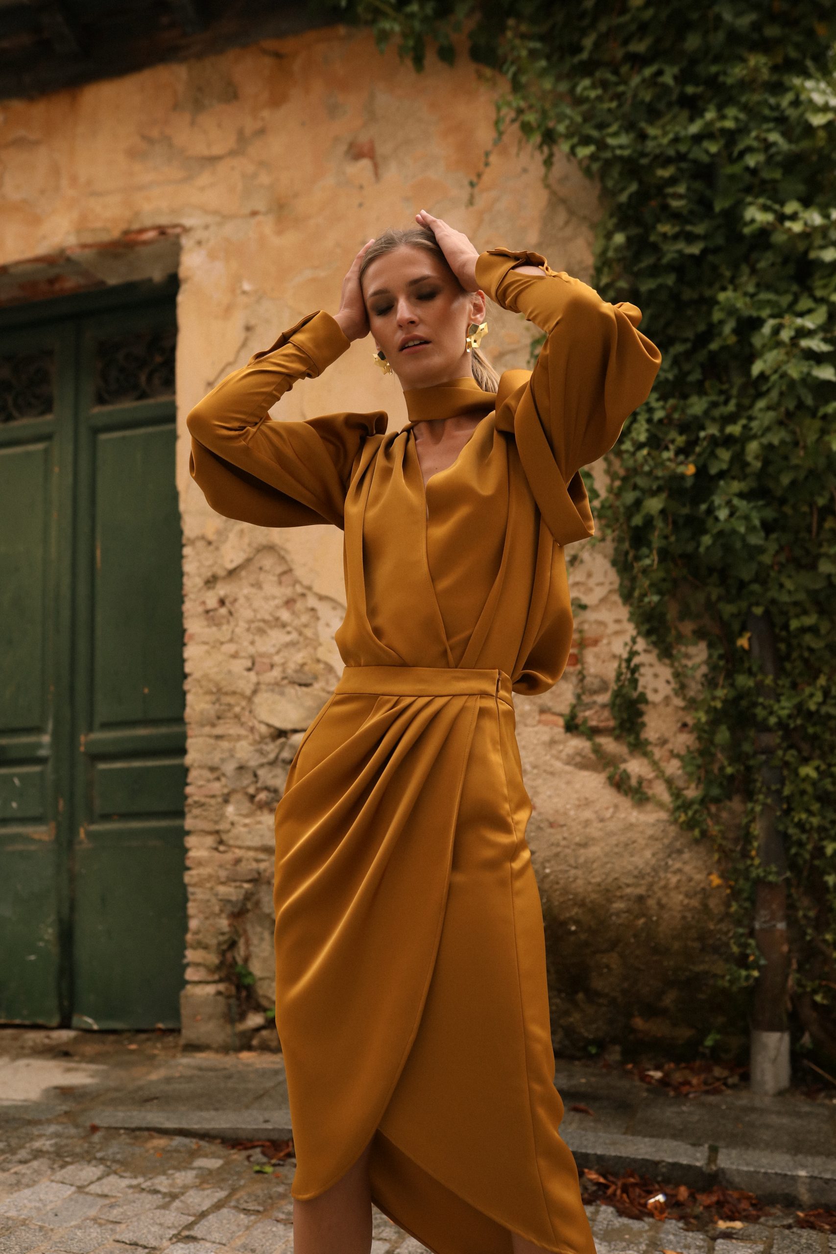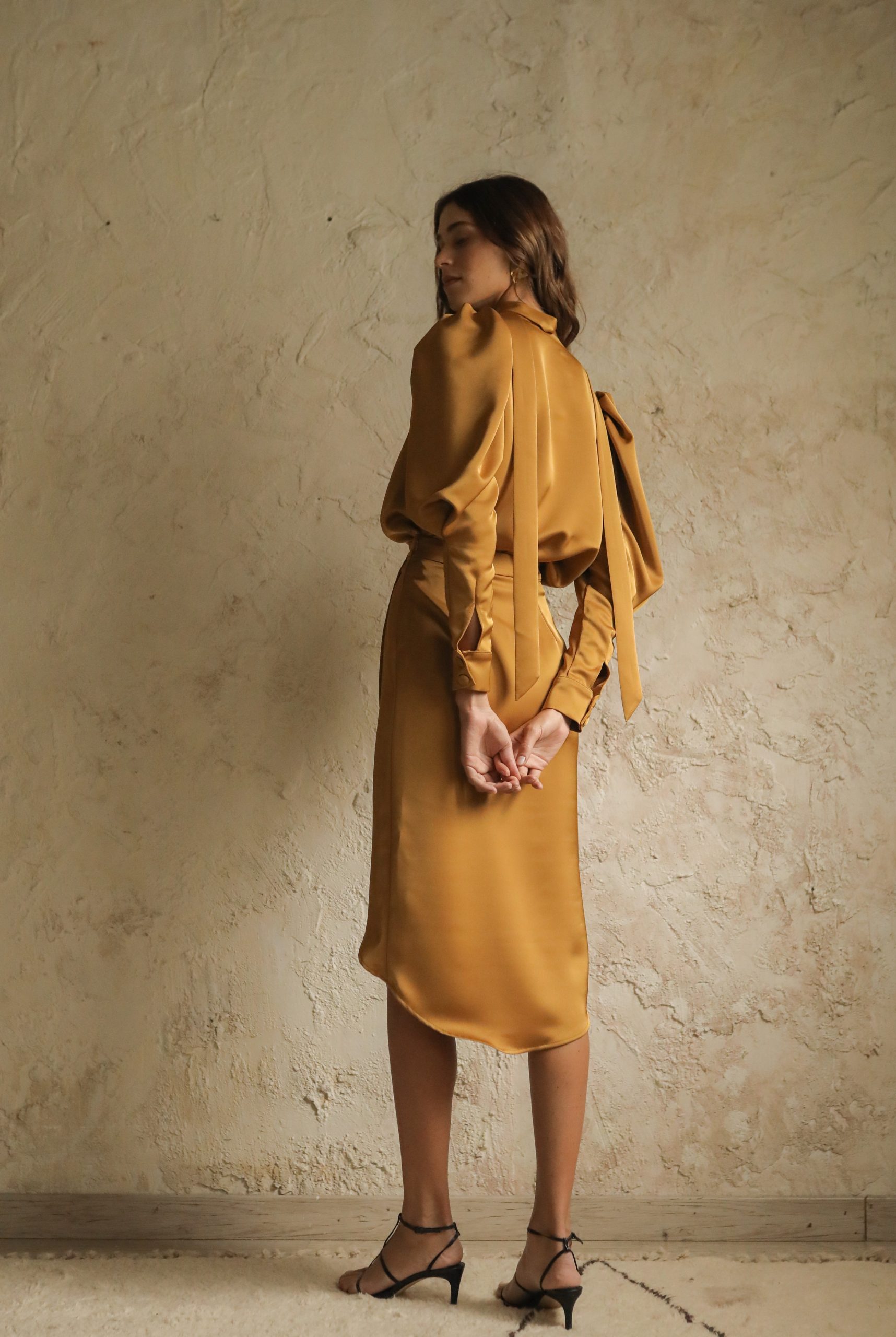 Falda midi de tiro alto con caída de pliegues frontales. Cremallera invisible lateral.