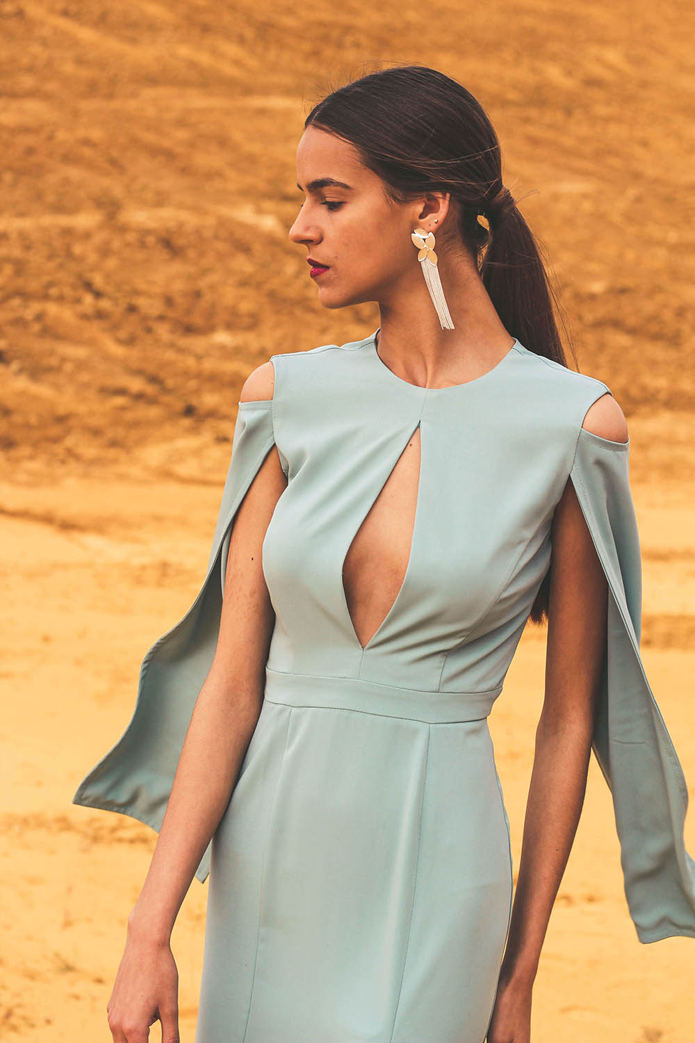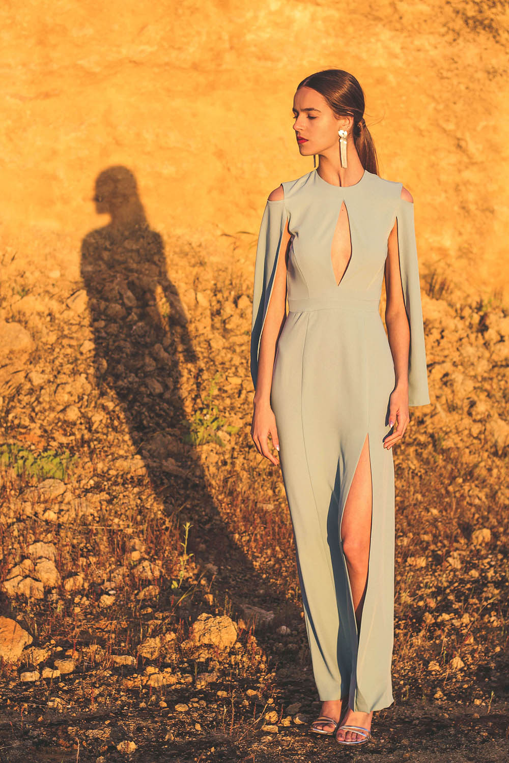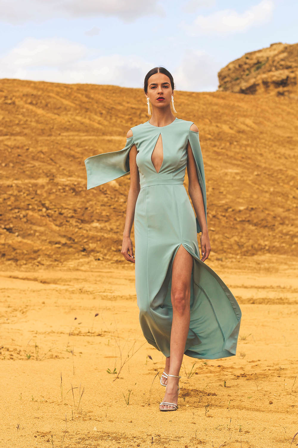 - Cuello cerrado y escote delantero en forma de lágrima pronunciado.