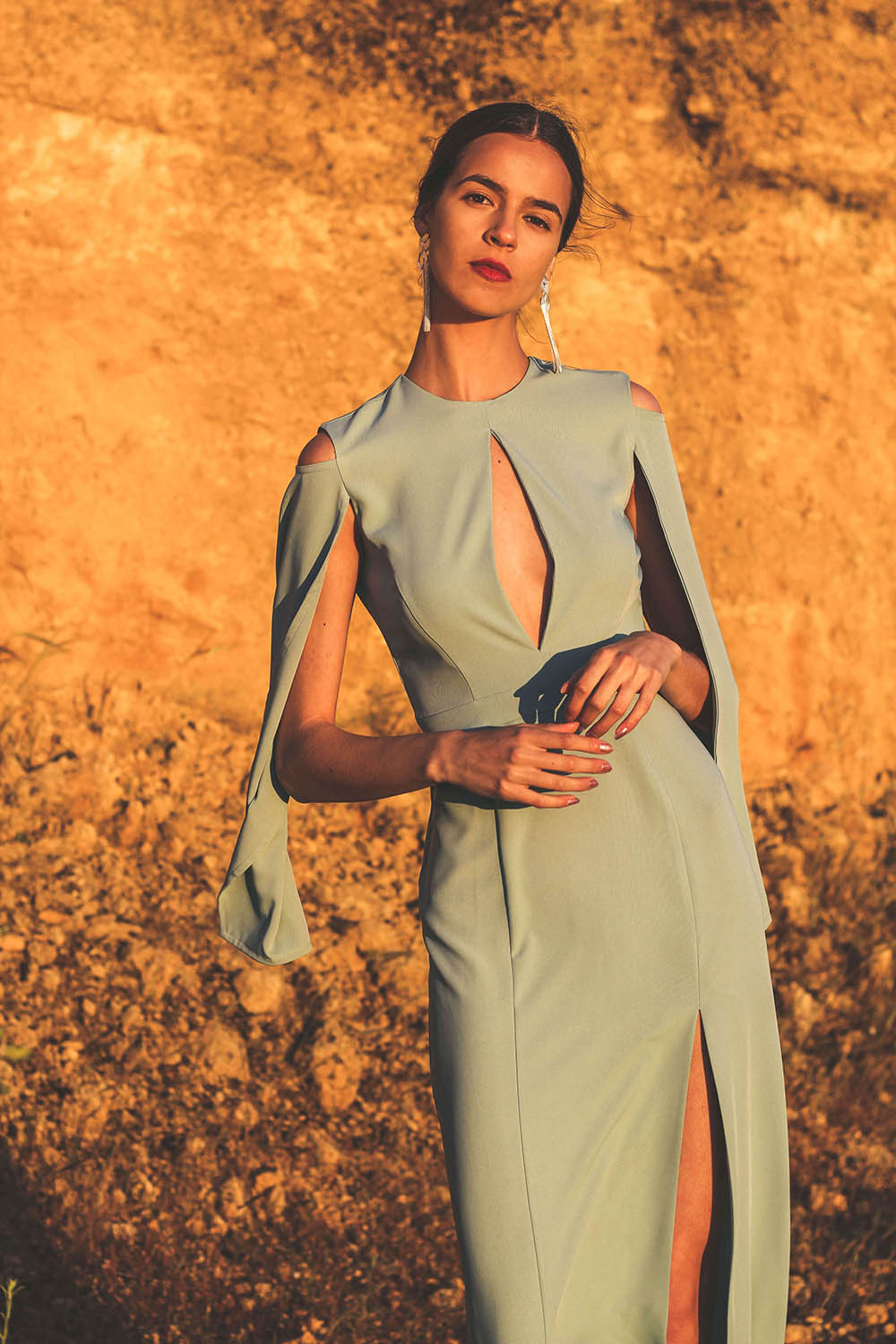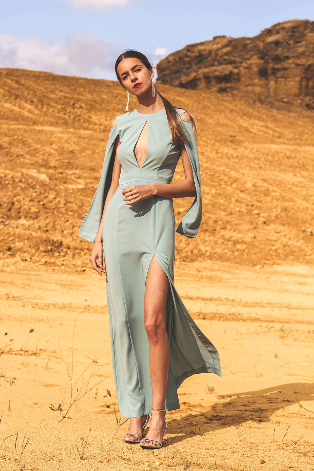 - Abertura frontal izquierda en falda que permite ver las piernas.