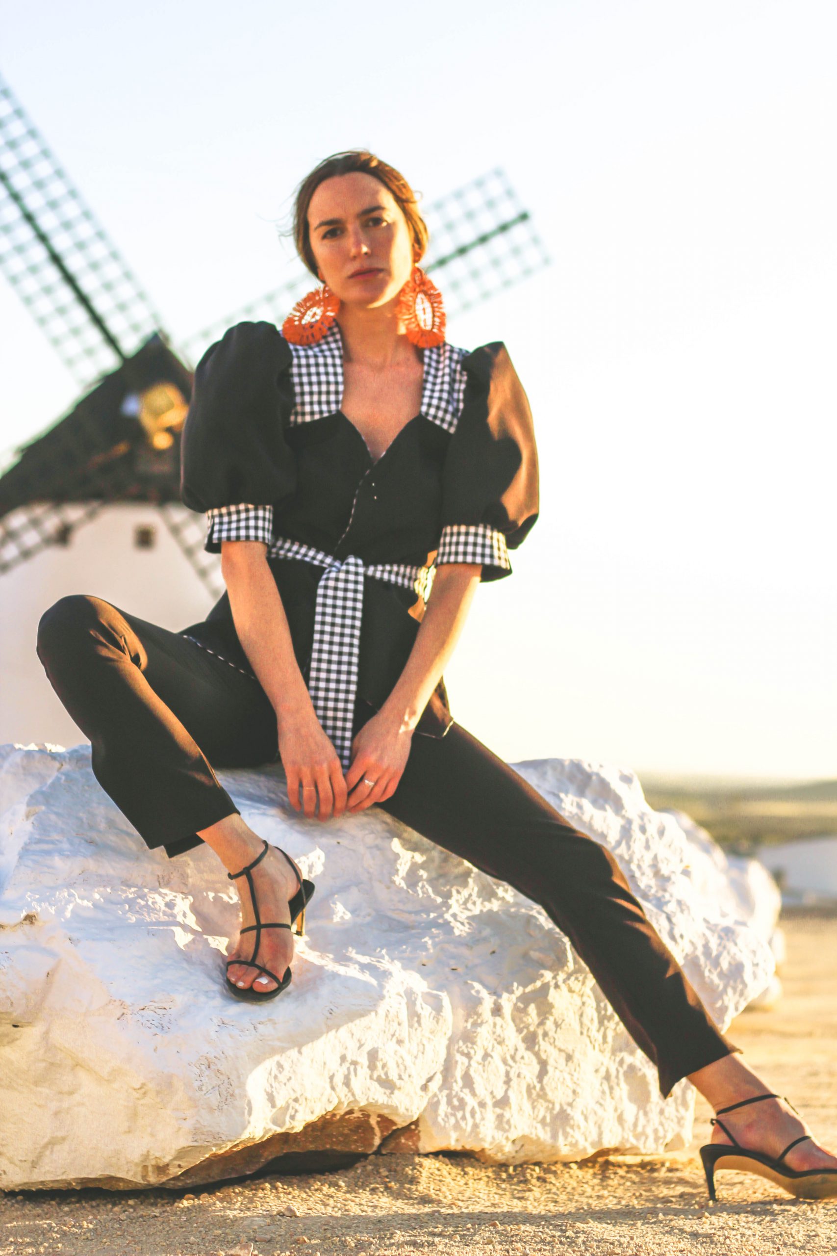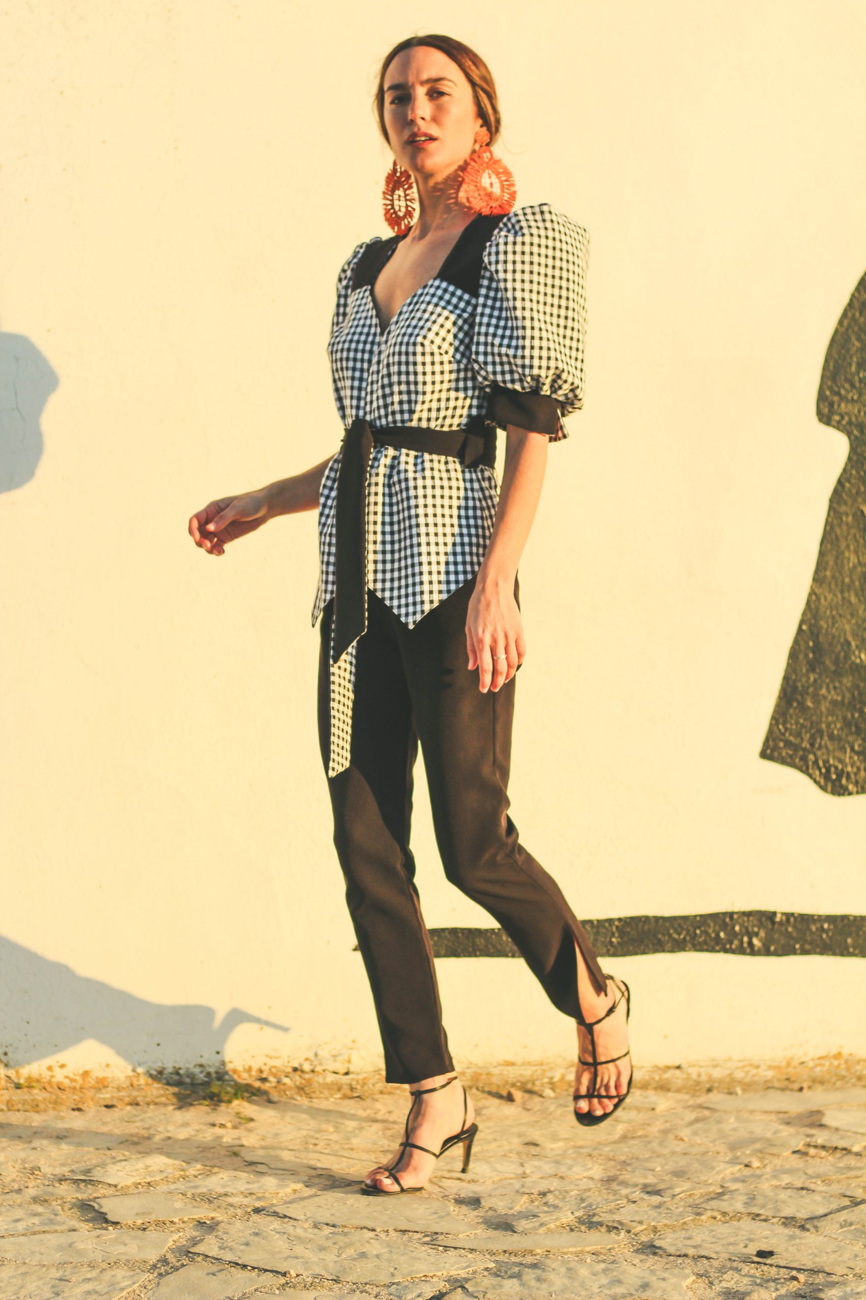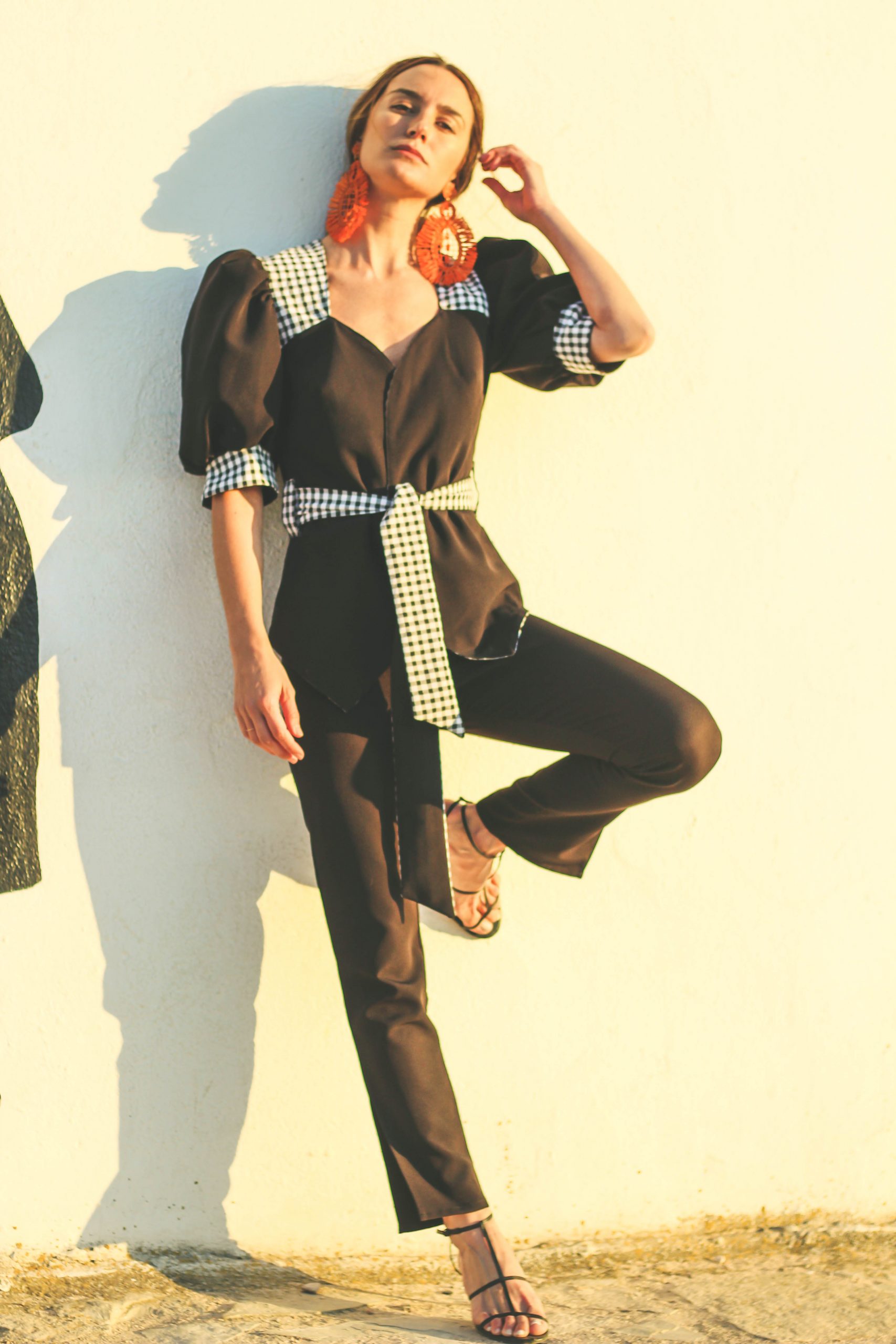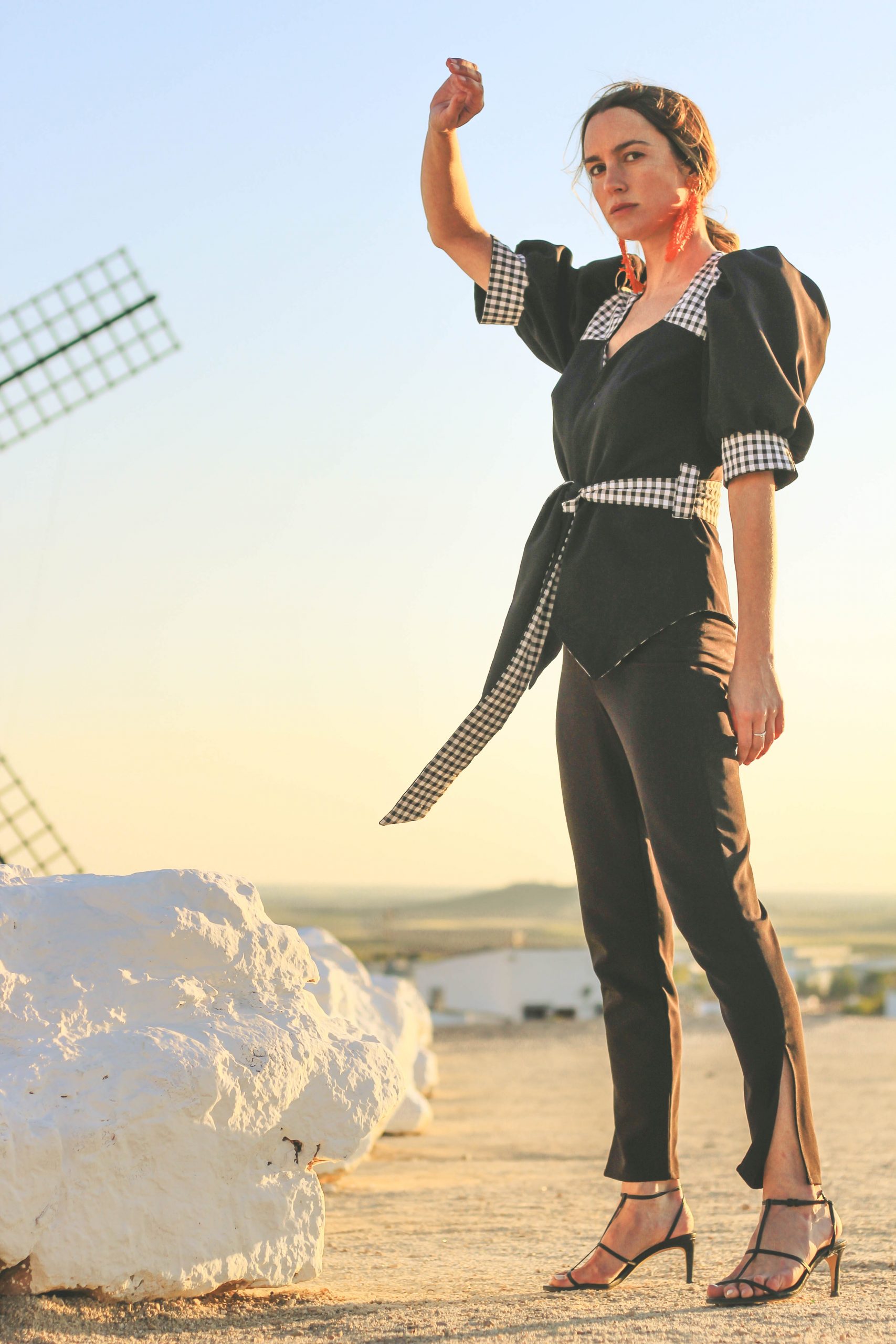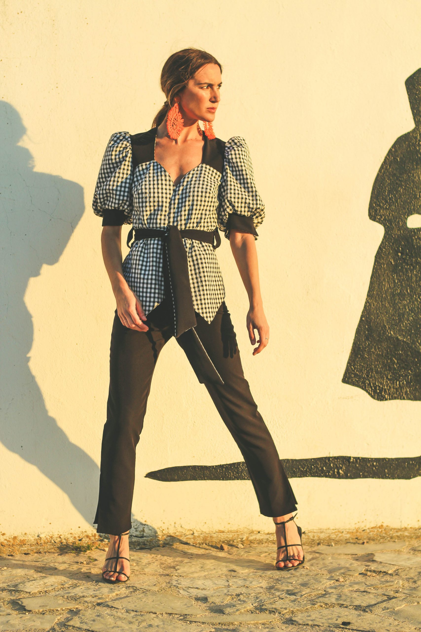 Chaqueta cruzada confeccionada en crêpe elástico. Maxi hombrera y solapa en contraste. Línea vertical en espalda. Mangas de volante con abertura lateral.