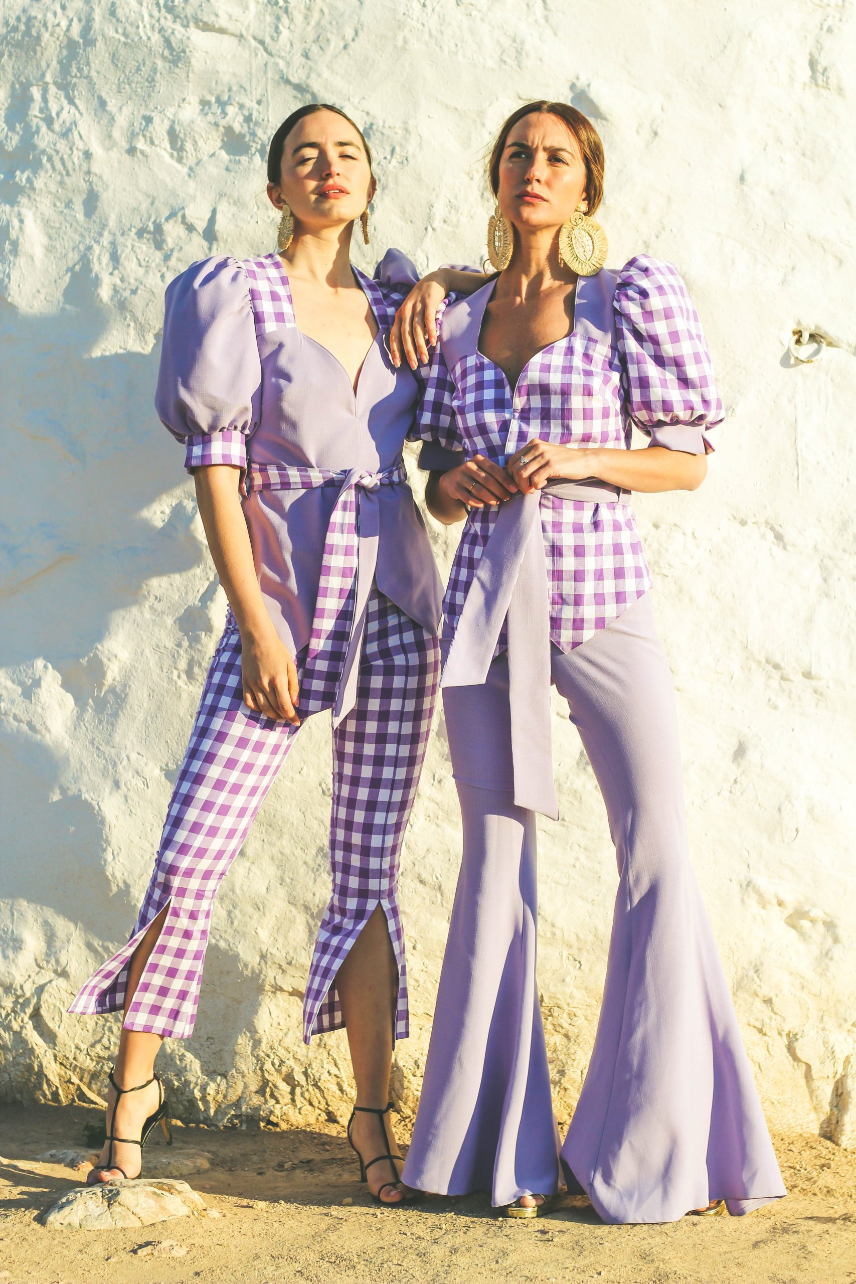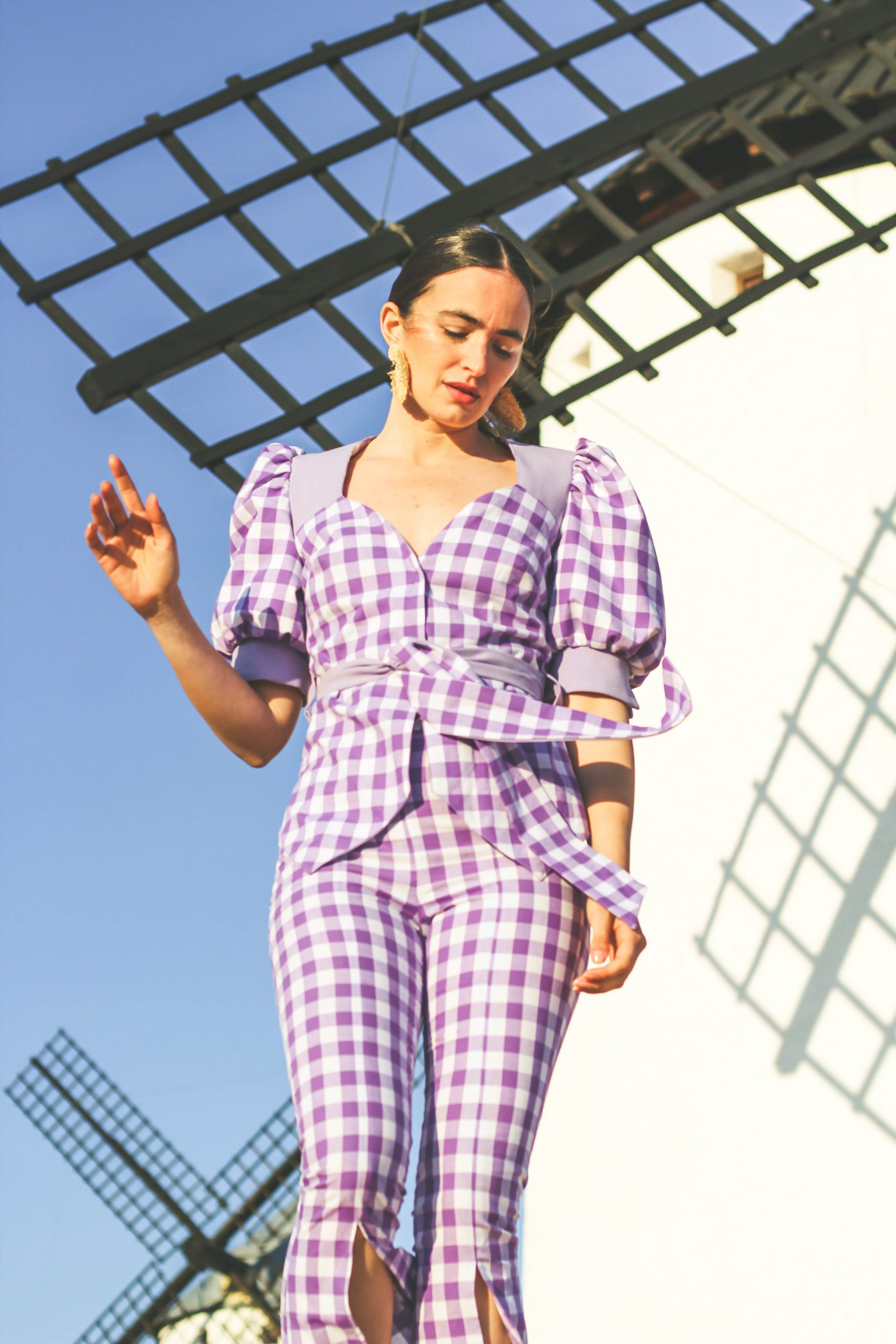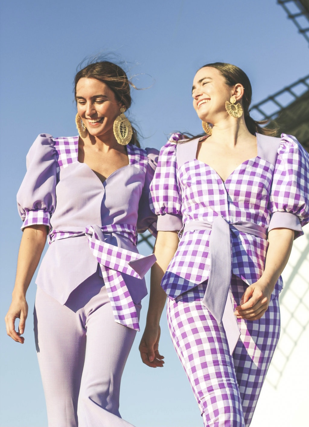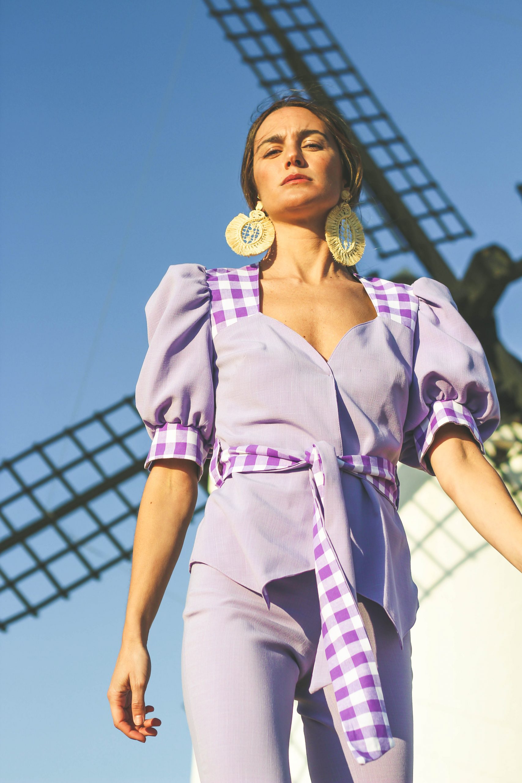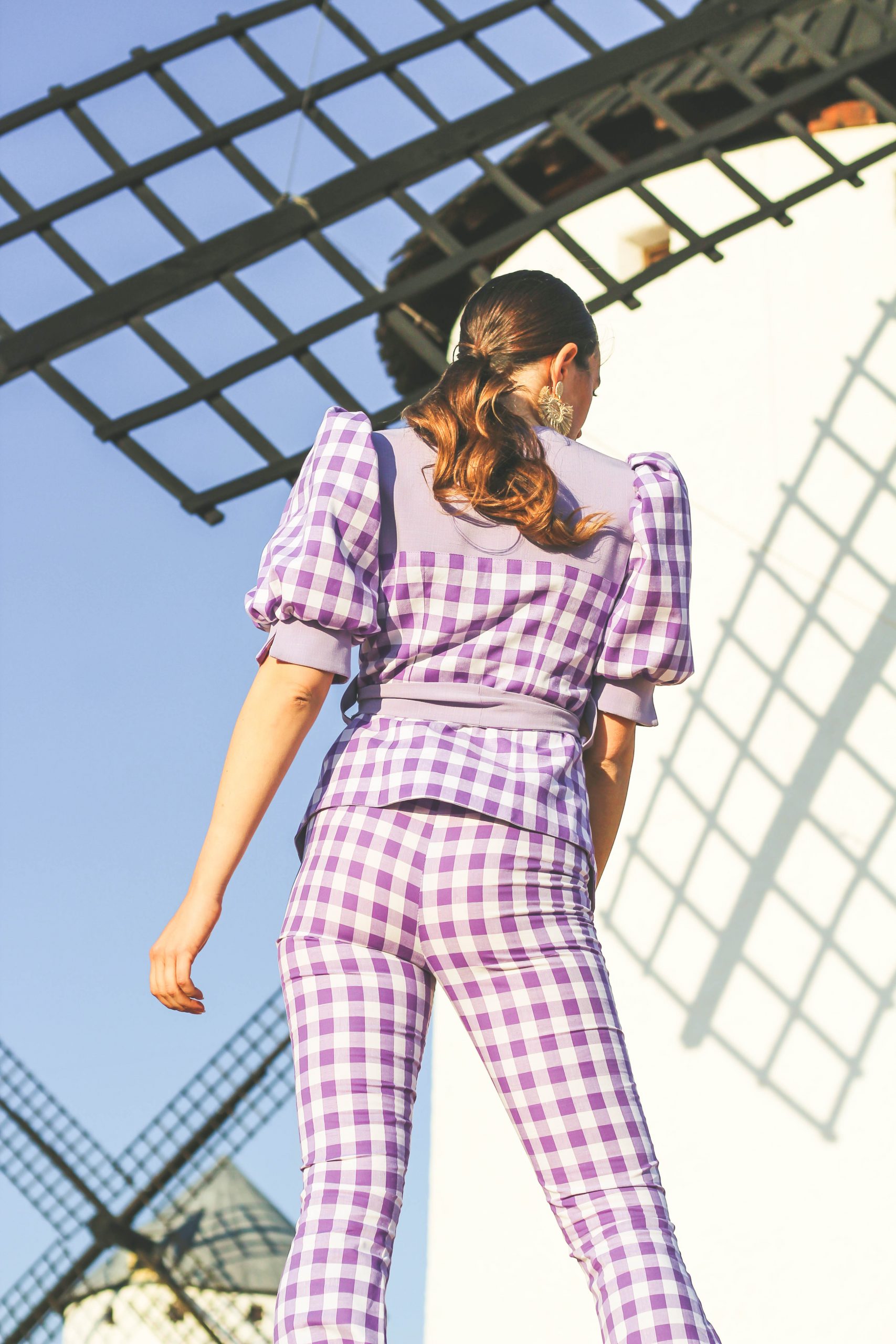 Chaqueta reversible con contrastes simétricos tanto en delantero como en espalda. Manga abullonada. Cinturón incluido.