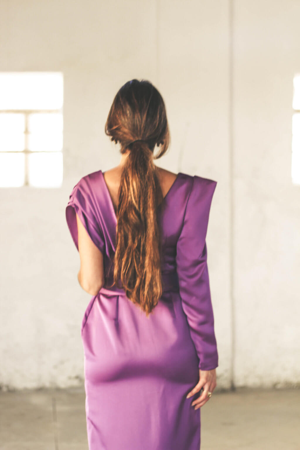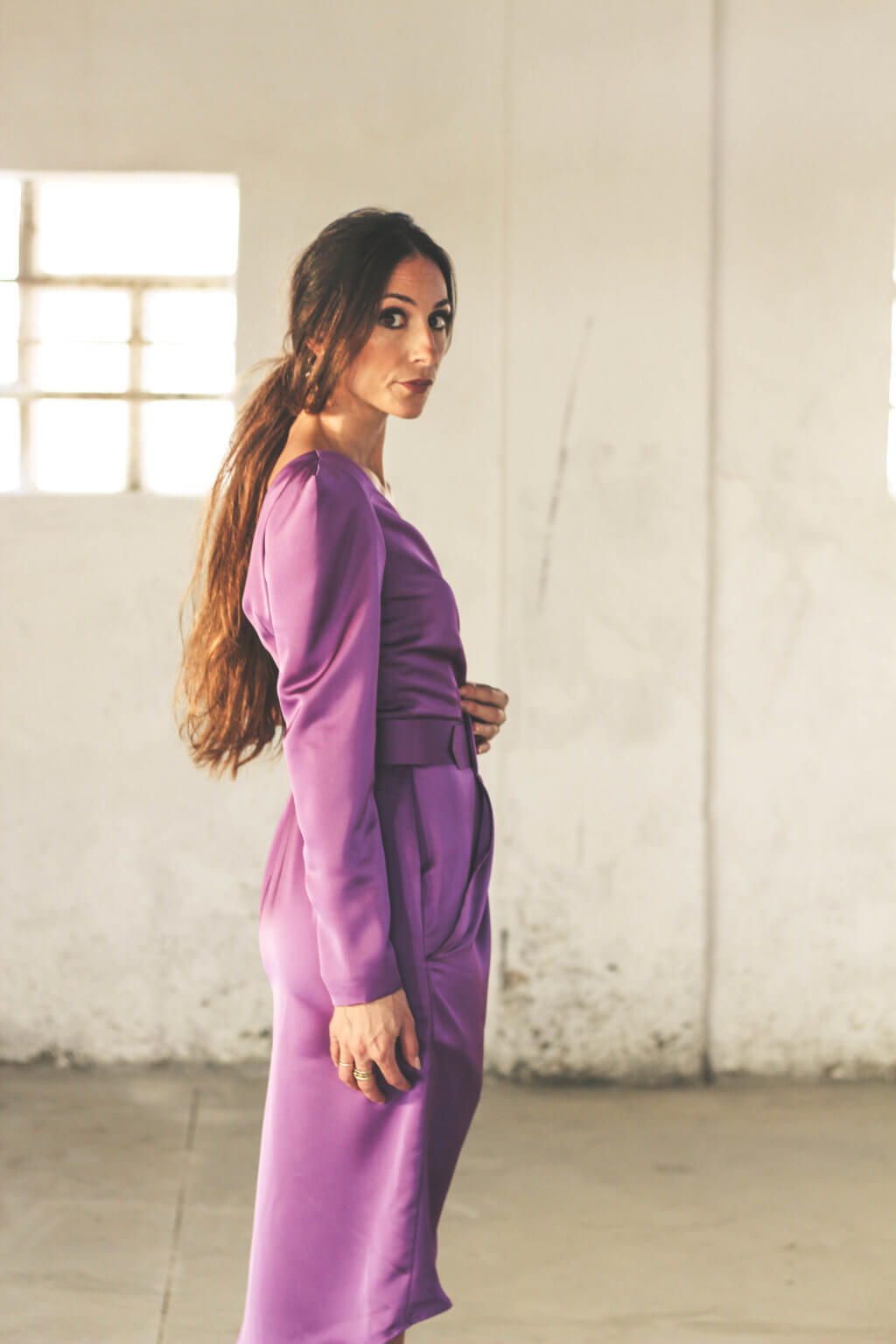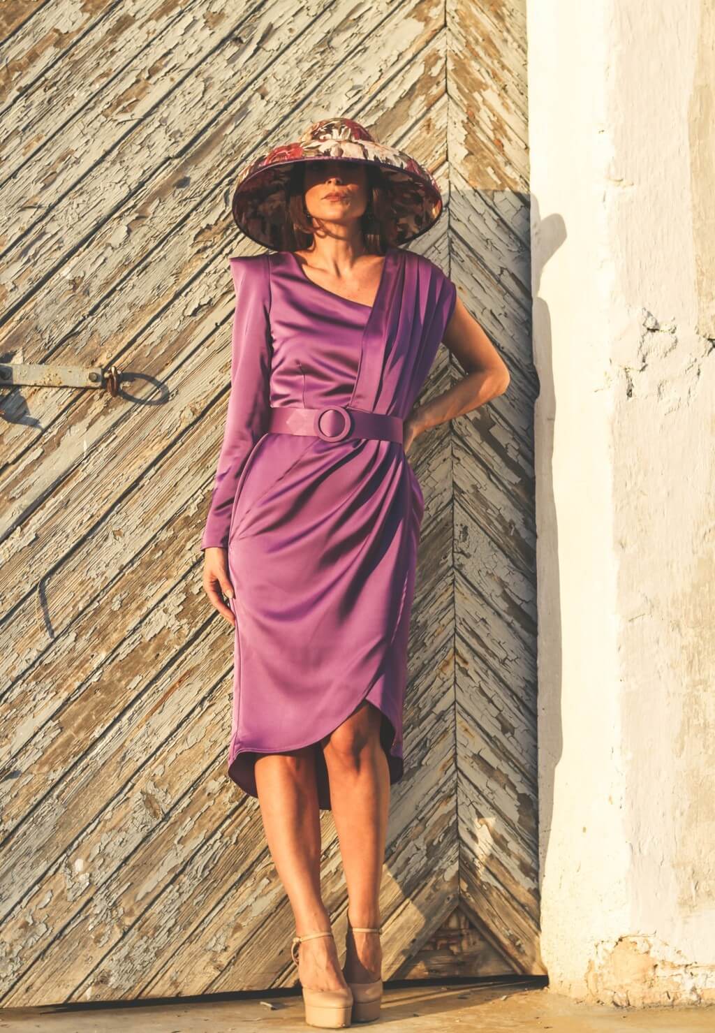 - Corte en cintura para realzar la figura femenina y caída frontal de pliegues en falda.