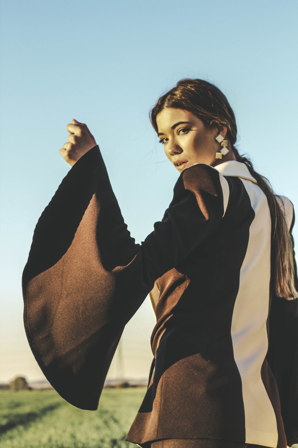 Chaqueta cruzada confeccionada en crêpe elástico.