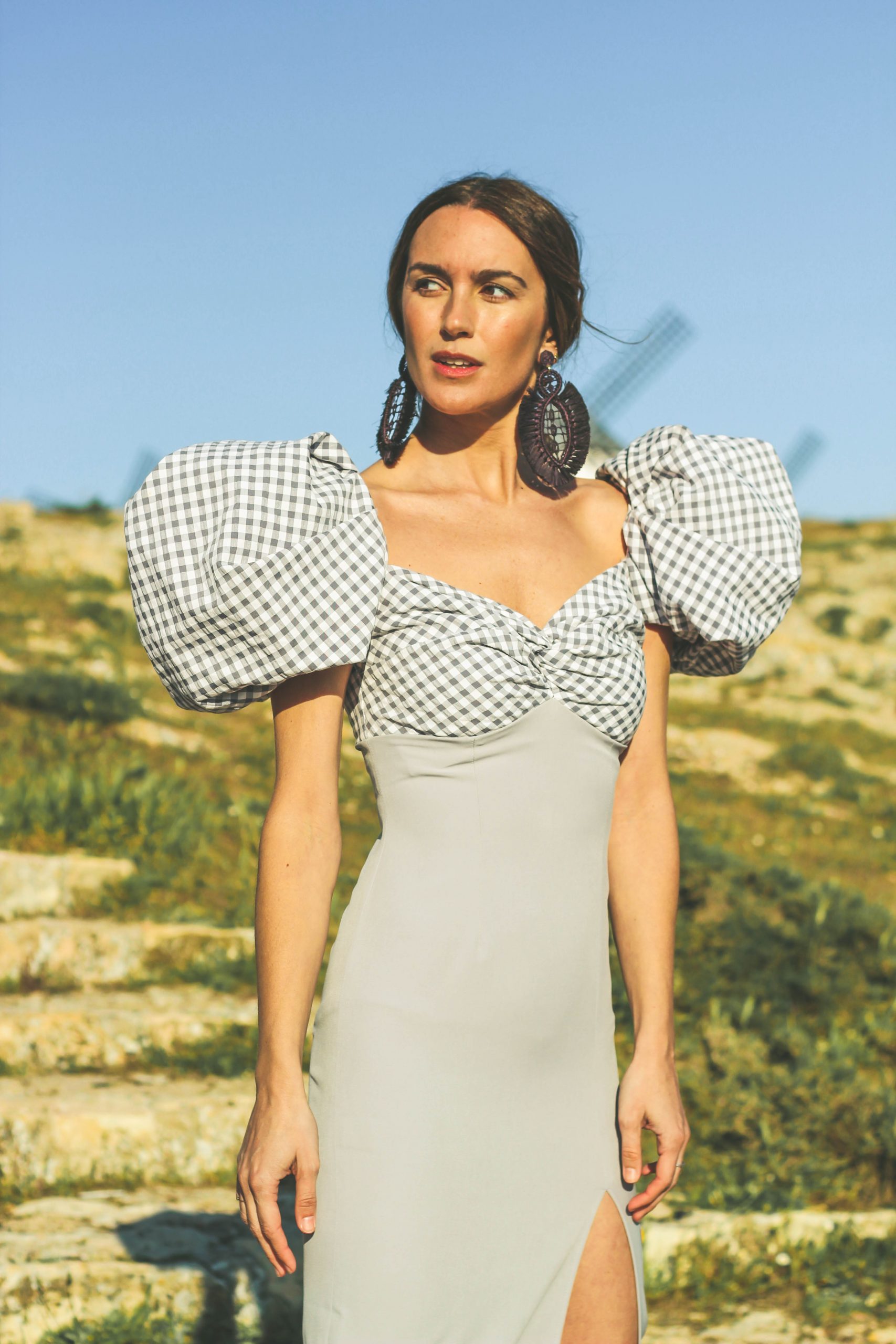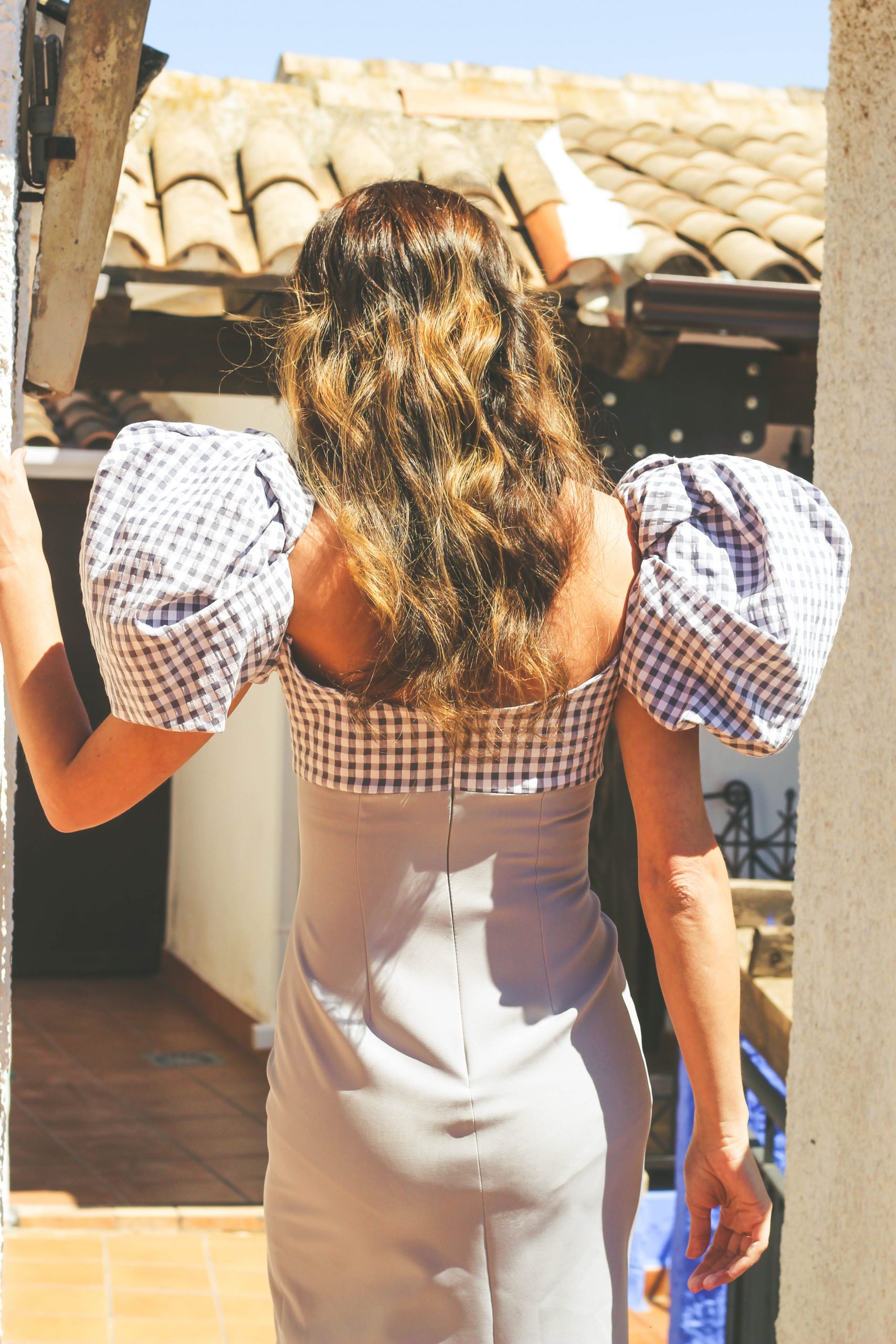 Vestido midi con mangas bishop confeccionado en crêpe elastico.