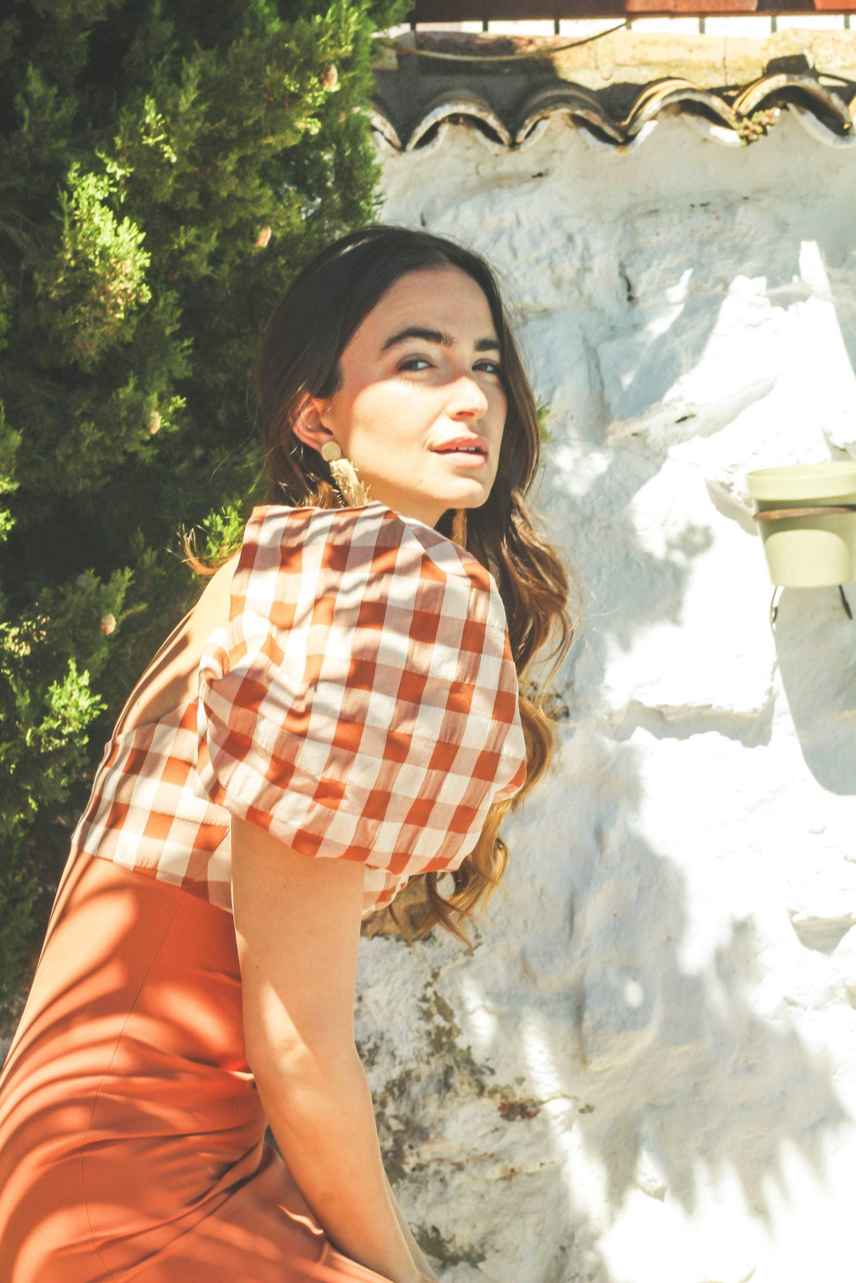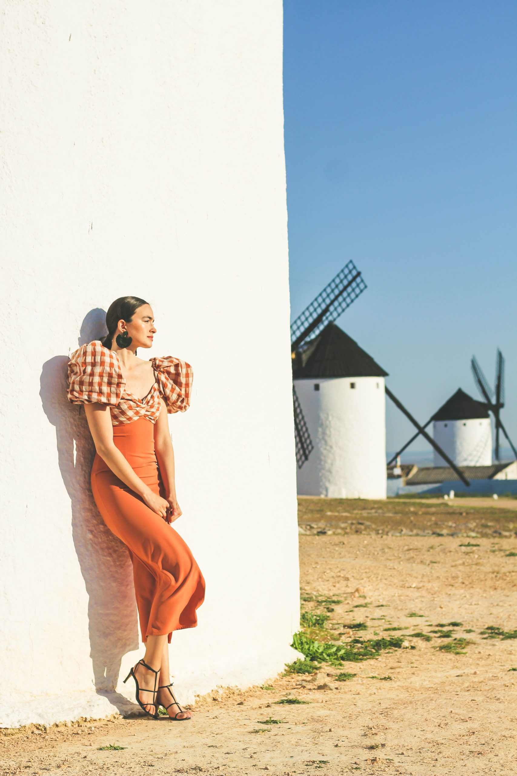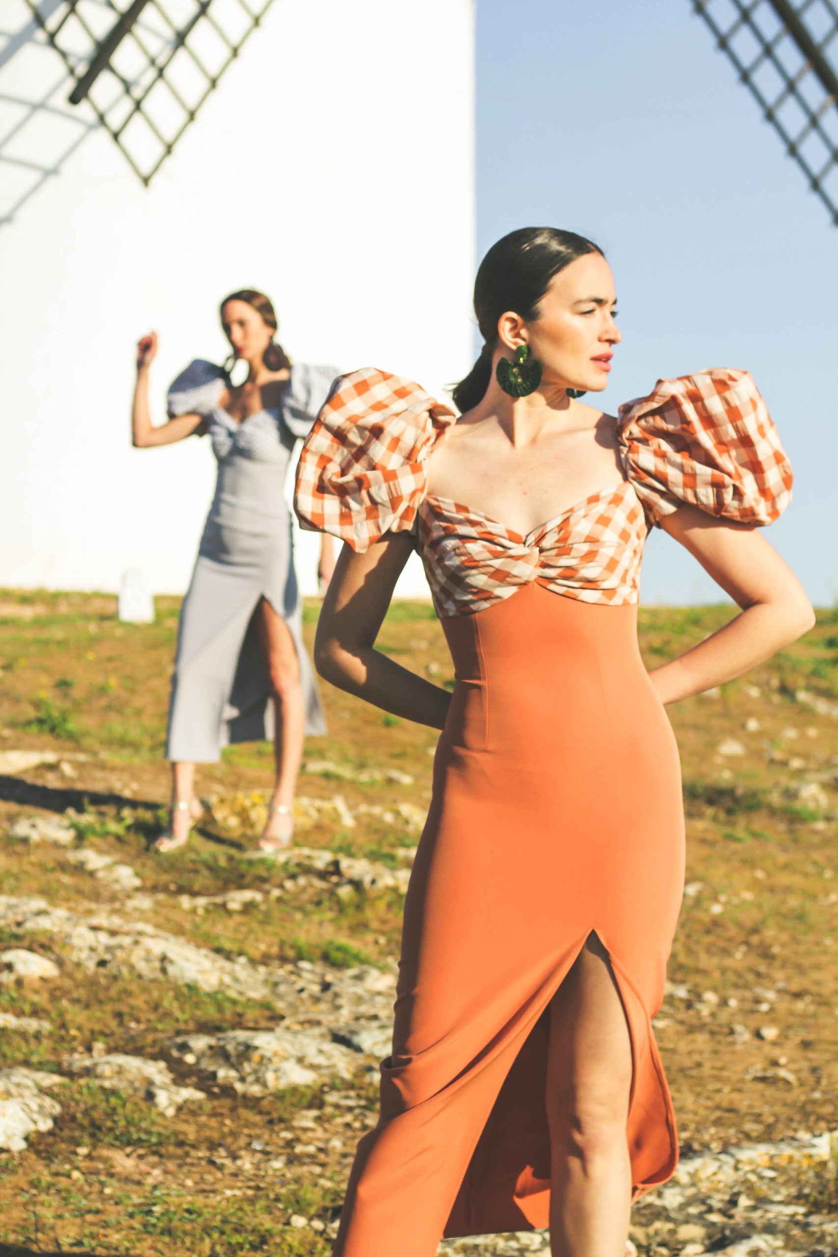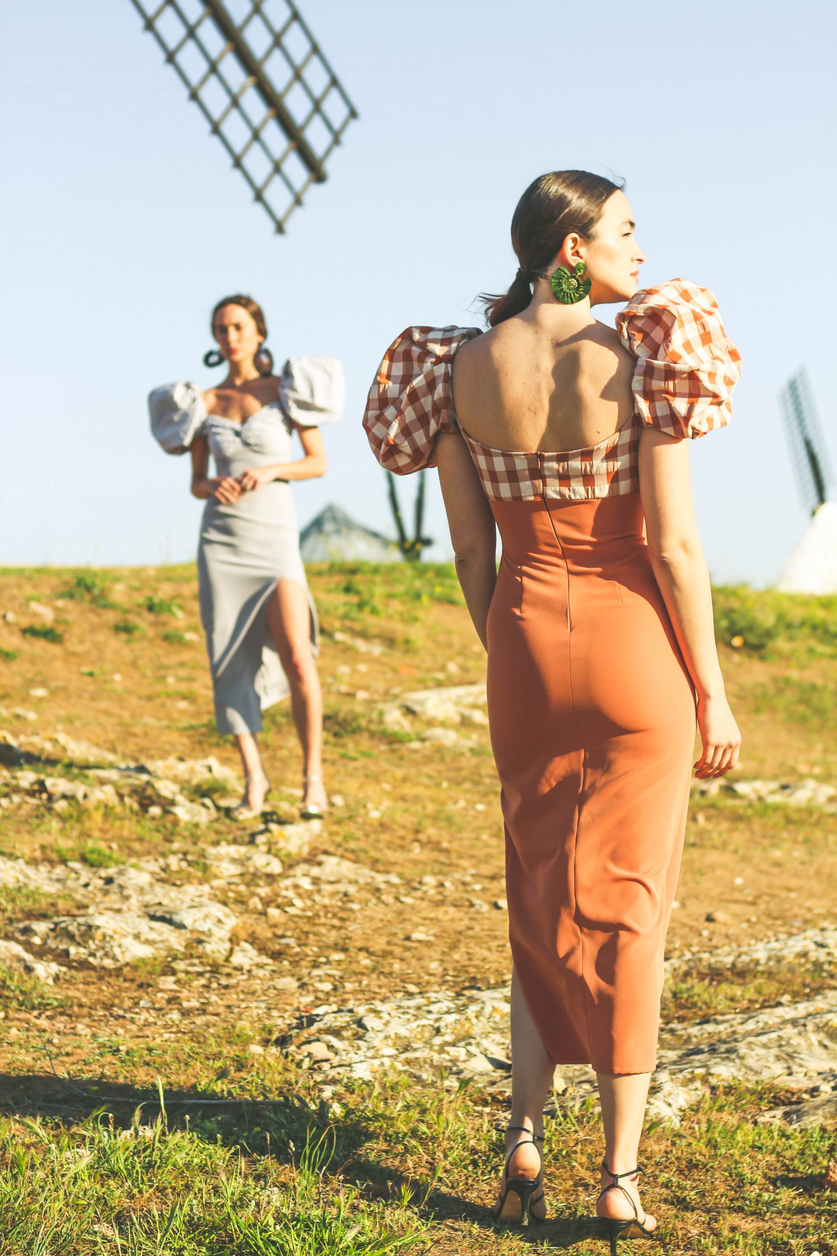 Vestido midi con mangas bishop confeccionado en crêpe elastico.