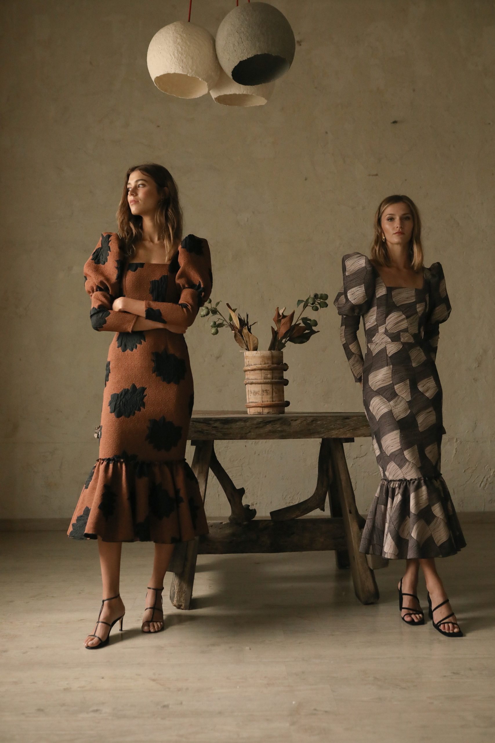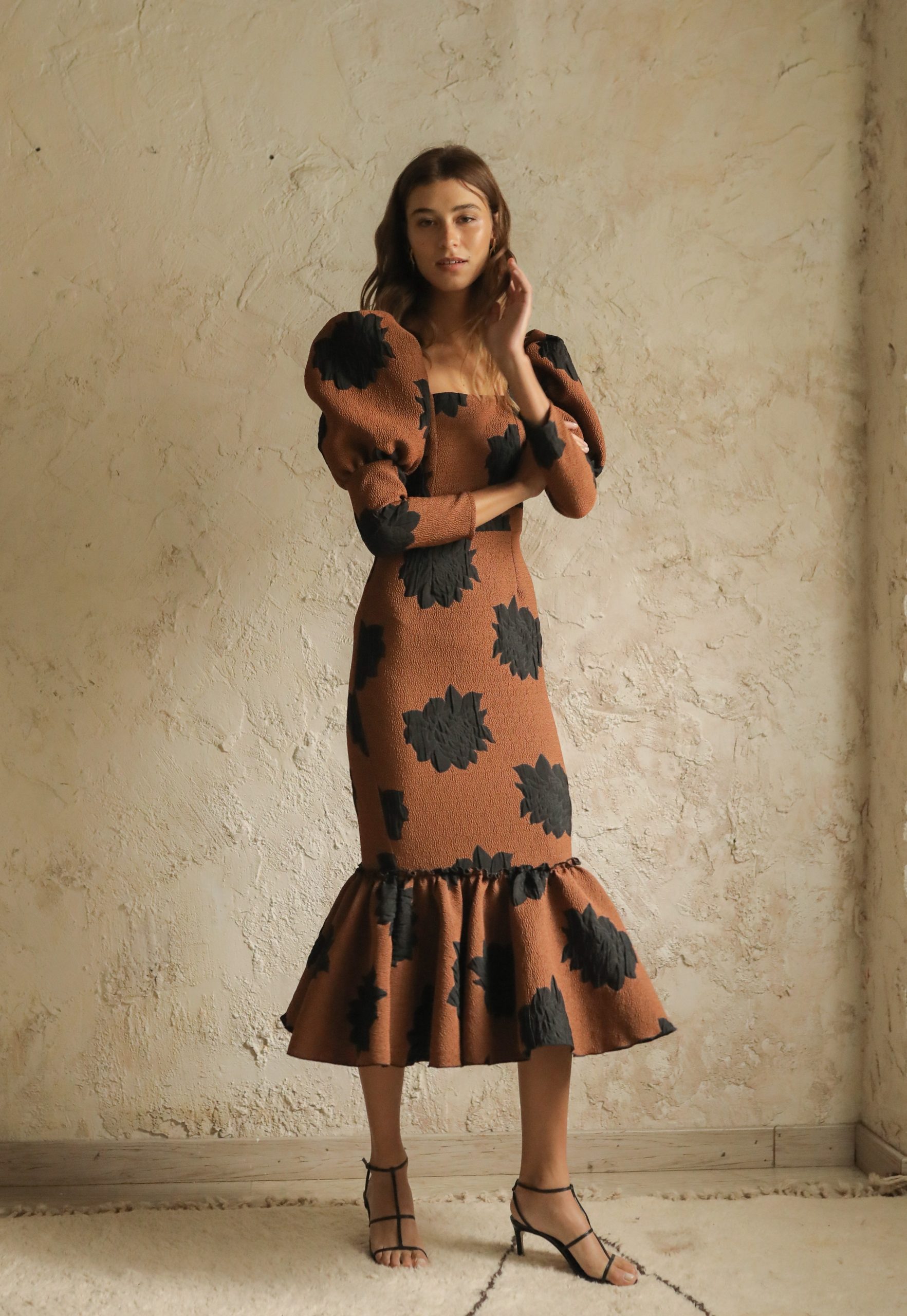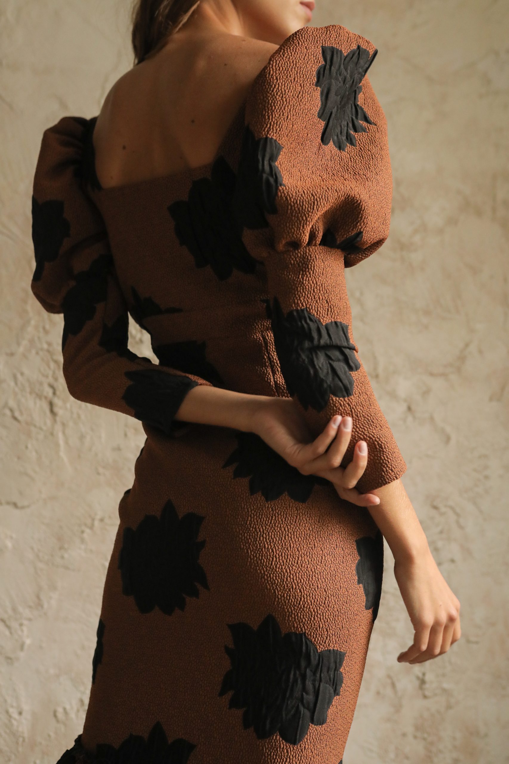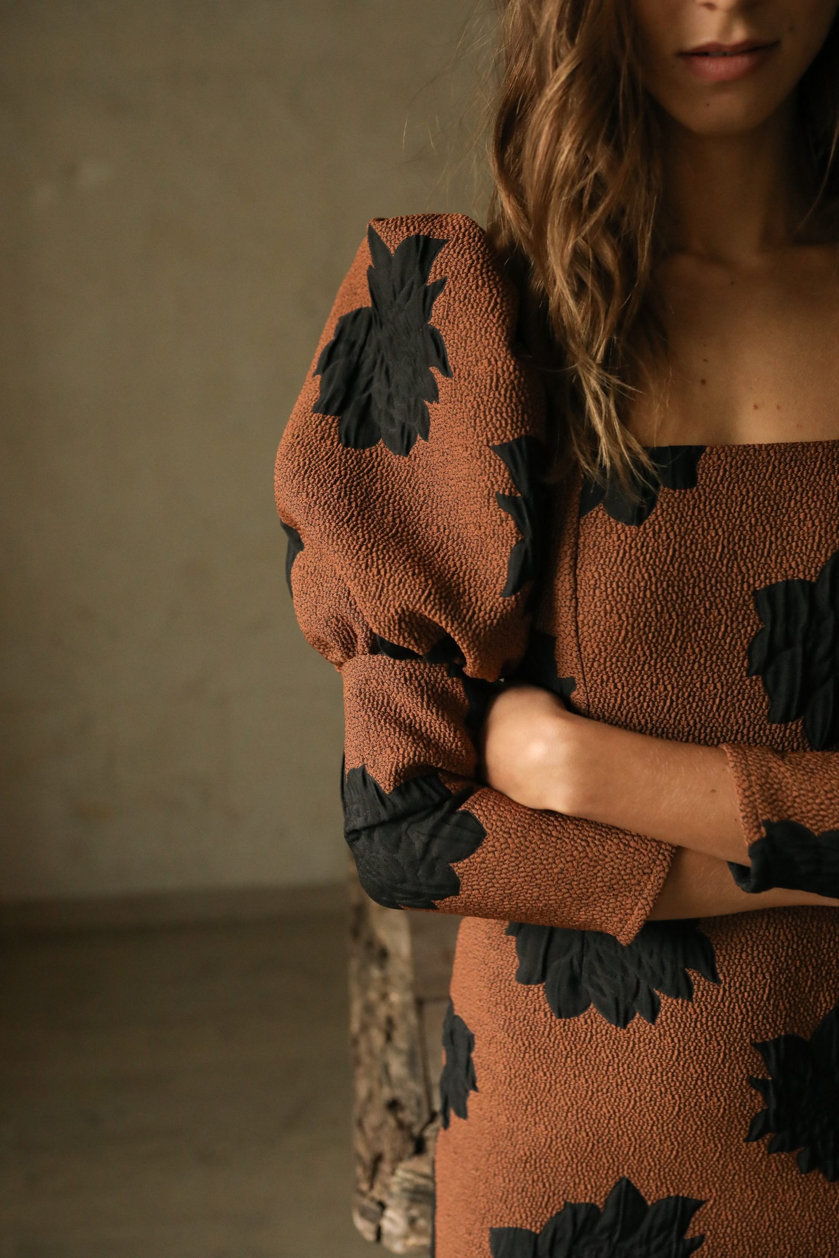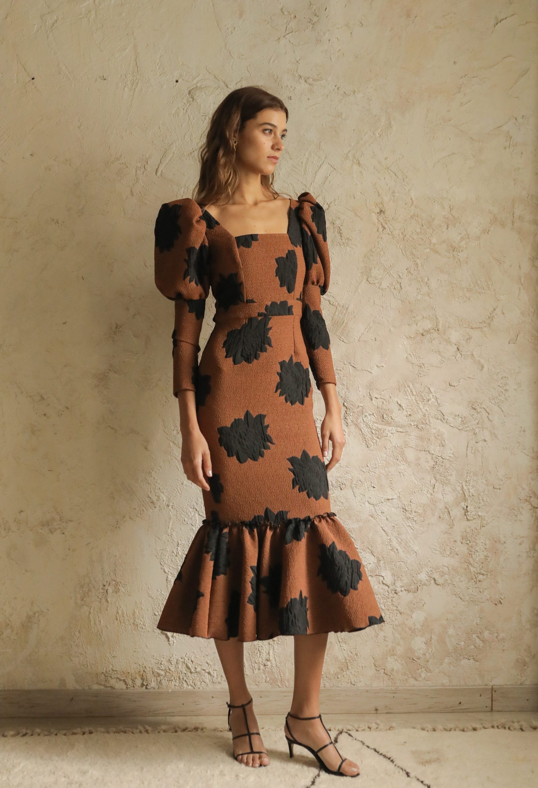 Vestido confeccionado en tejido jacquard. Escote abierto cuadrado en delantero y espalda. Mangas largas y abullonadas en hombros. Volante fruncido en bajo.