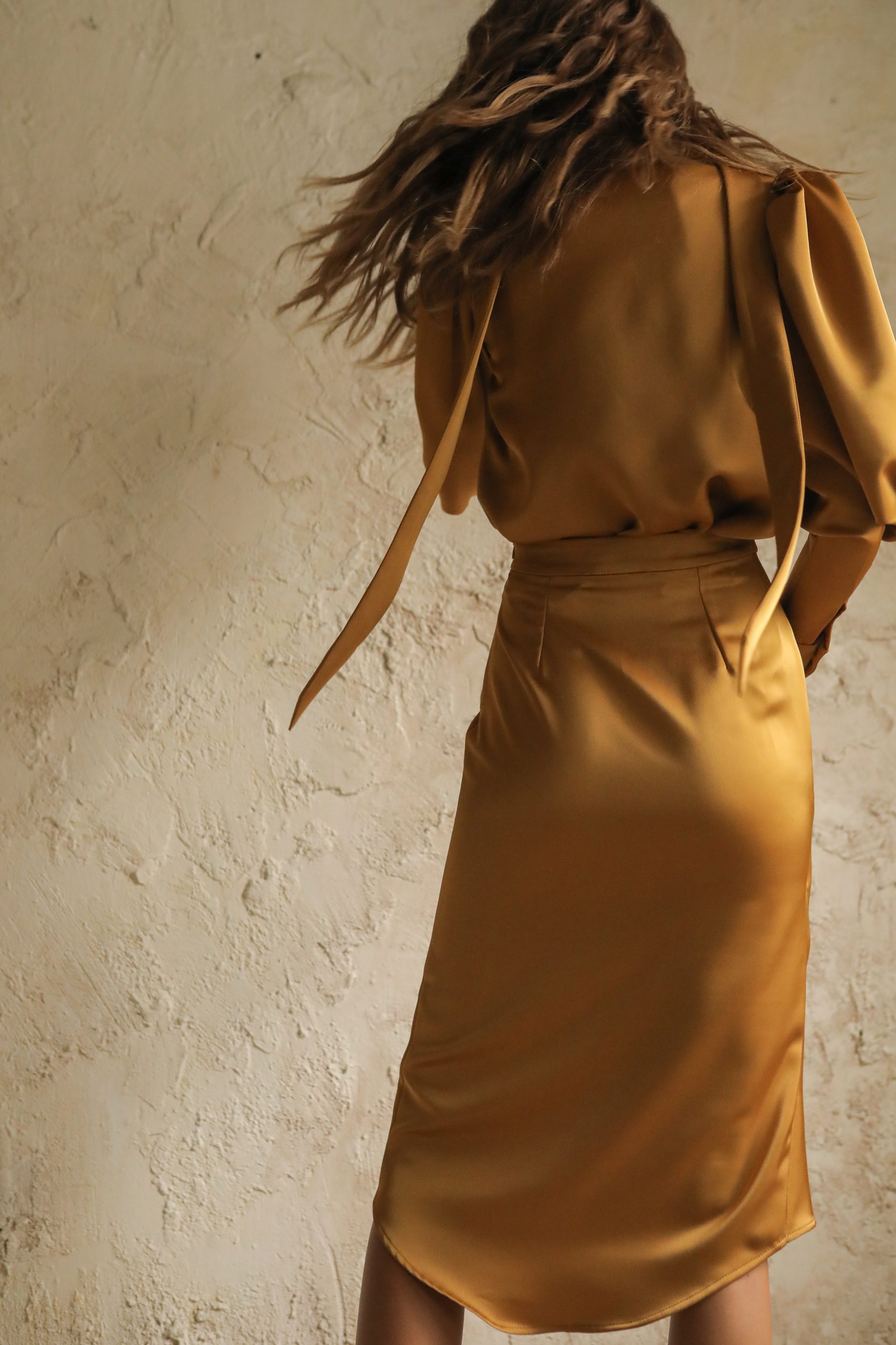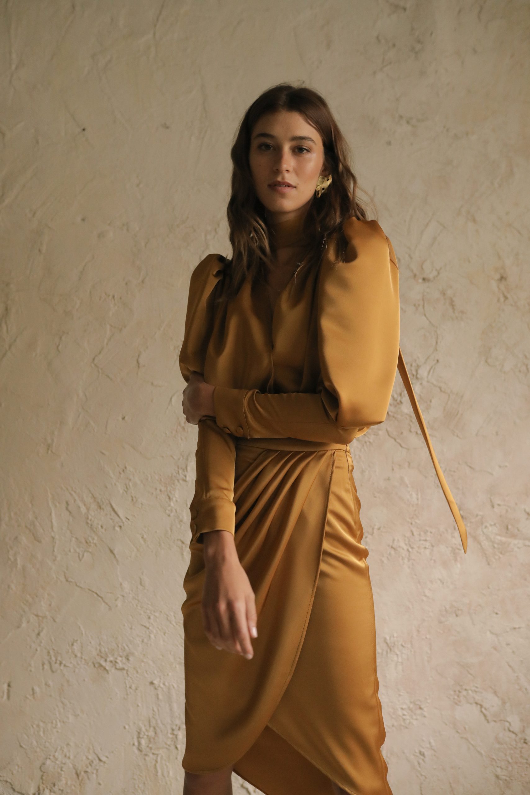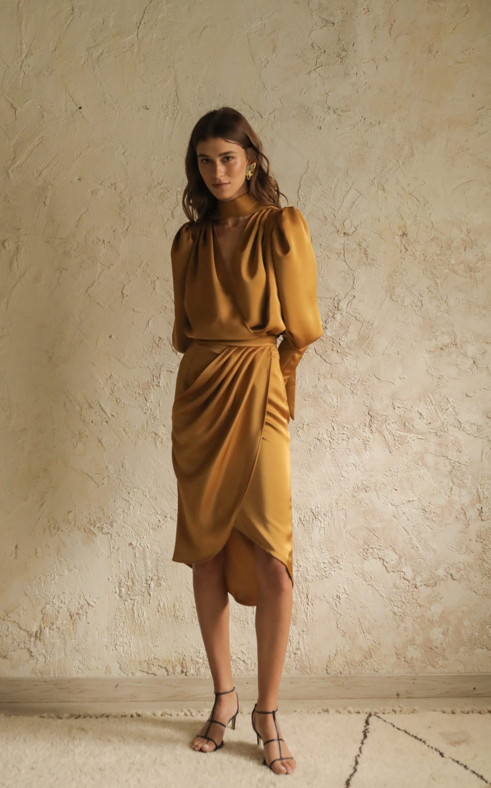 Blusa suelta con drapeado desde el hombro en delantero. Confeccionada en crêpe satén.