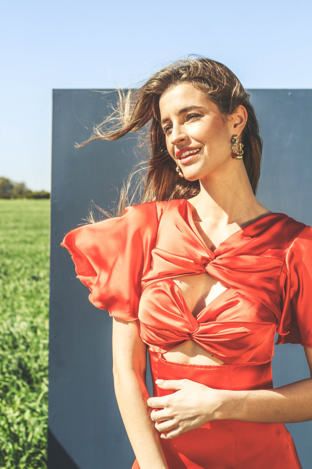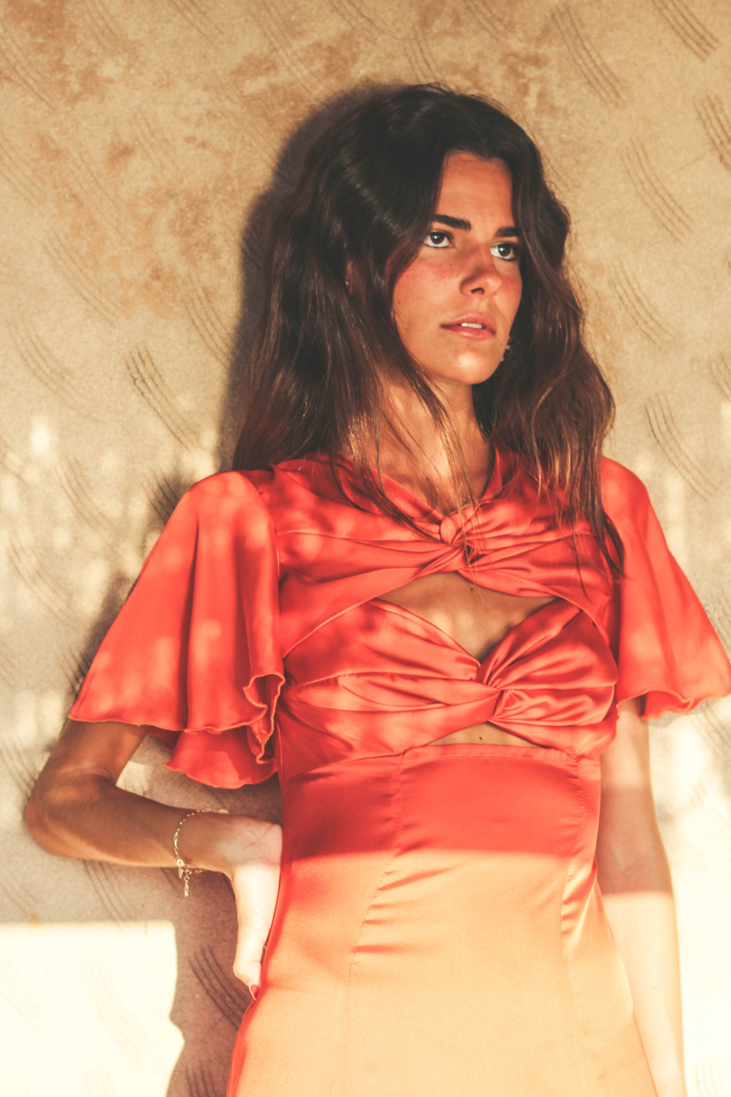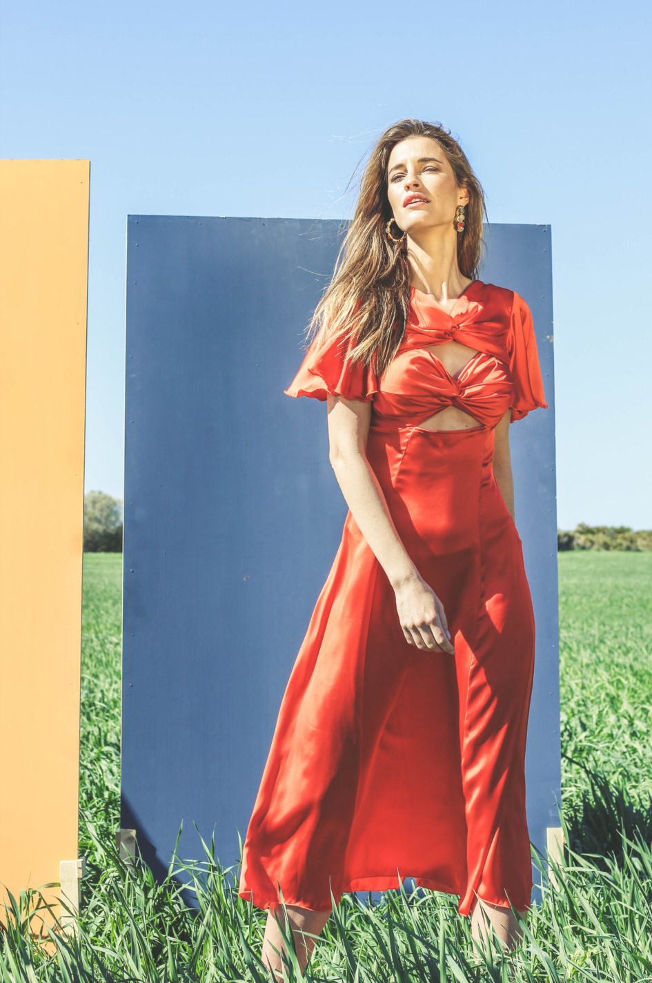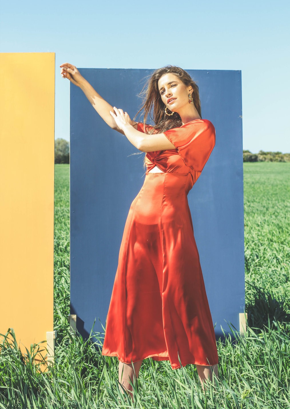 Vestido tobillero fluido, confeccionado en crêpe satén.