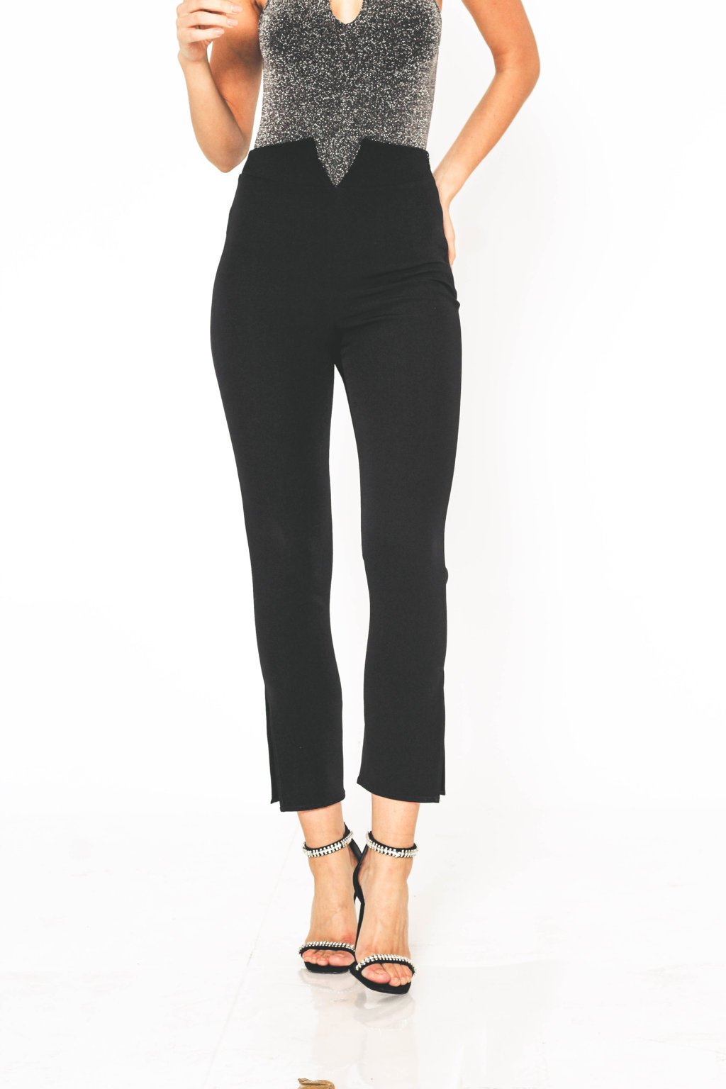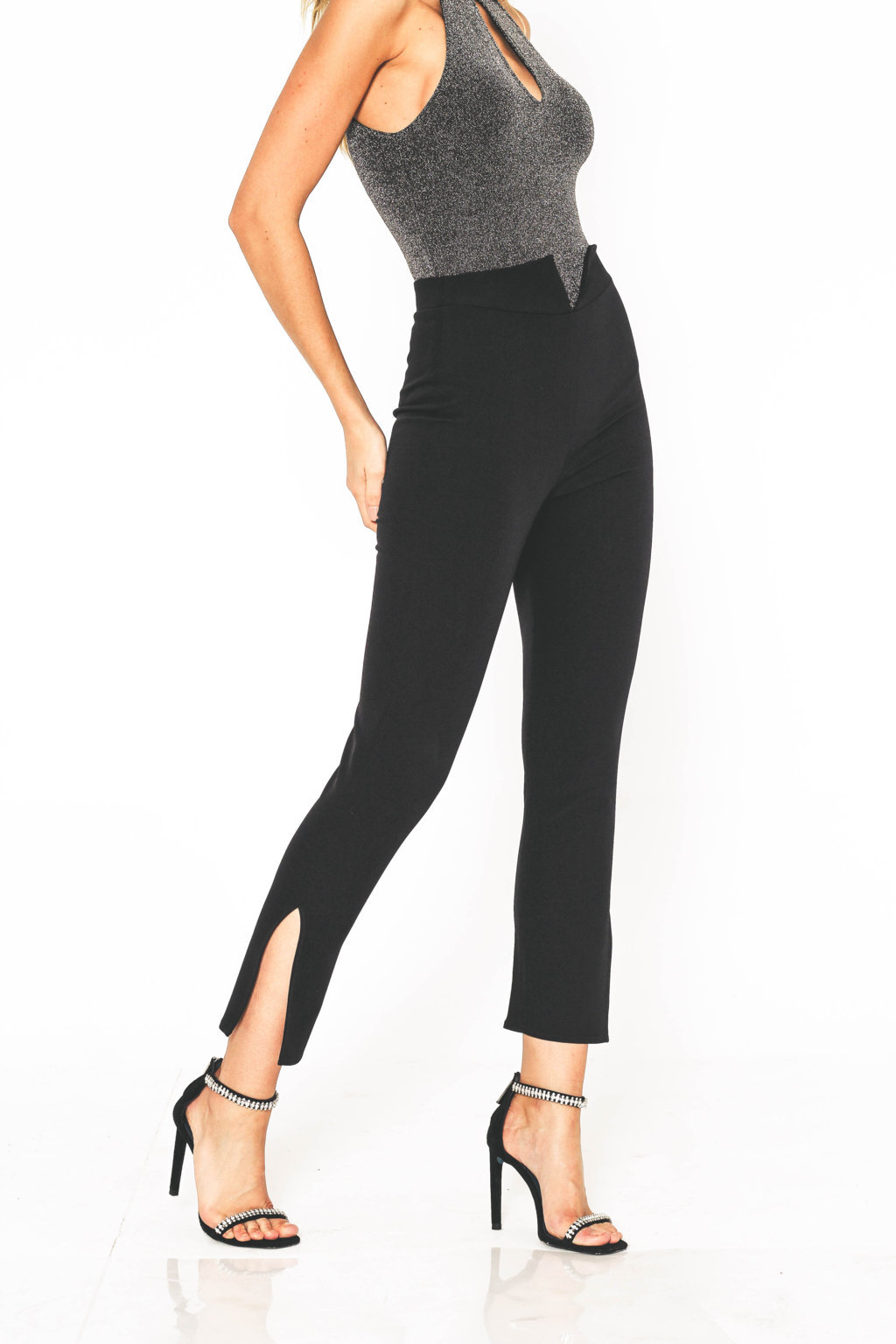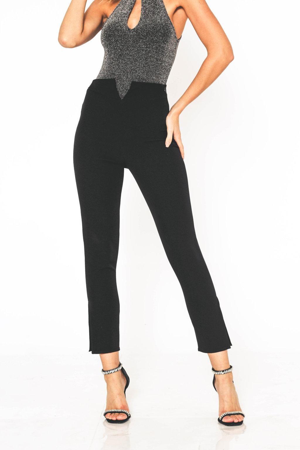 Pantalón pitillo de talle alto confeccionado en crêpe elástico. Cinturilla delantera con detalle en V. Abertura en los bajos laterales Cremallera invisible lateral.