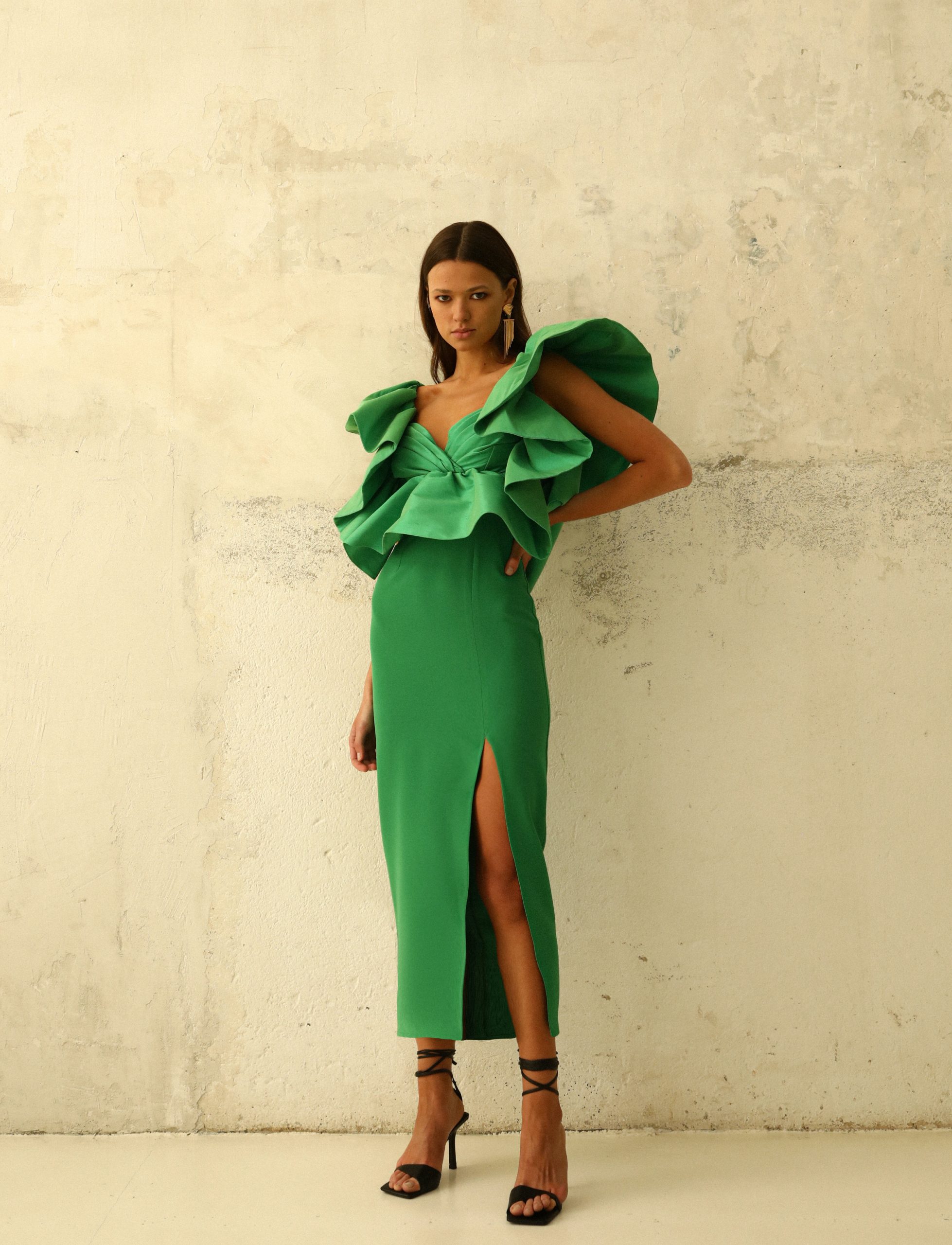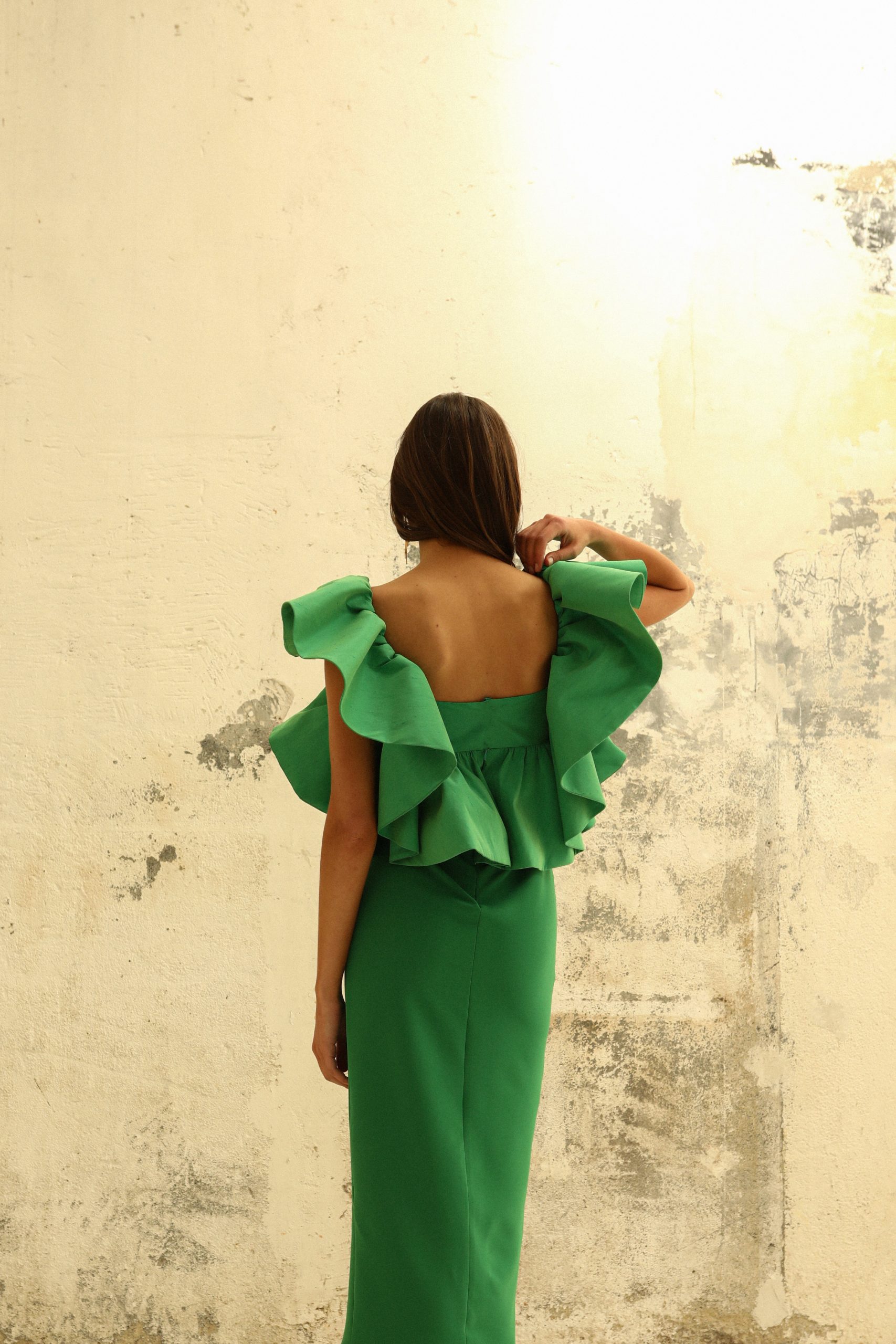 Escote cruzado drapeado y volante envolvente que bordea todo el escote y hace las veces de manga en tejido tafetán.