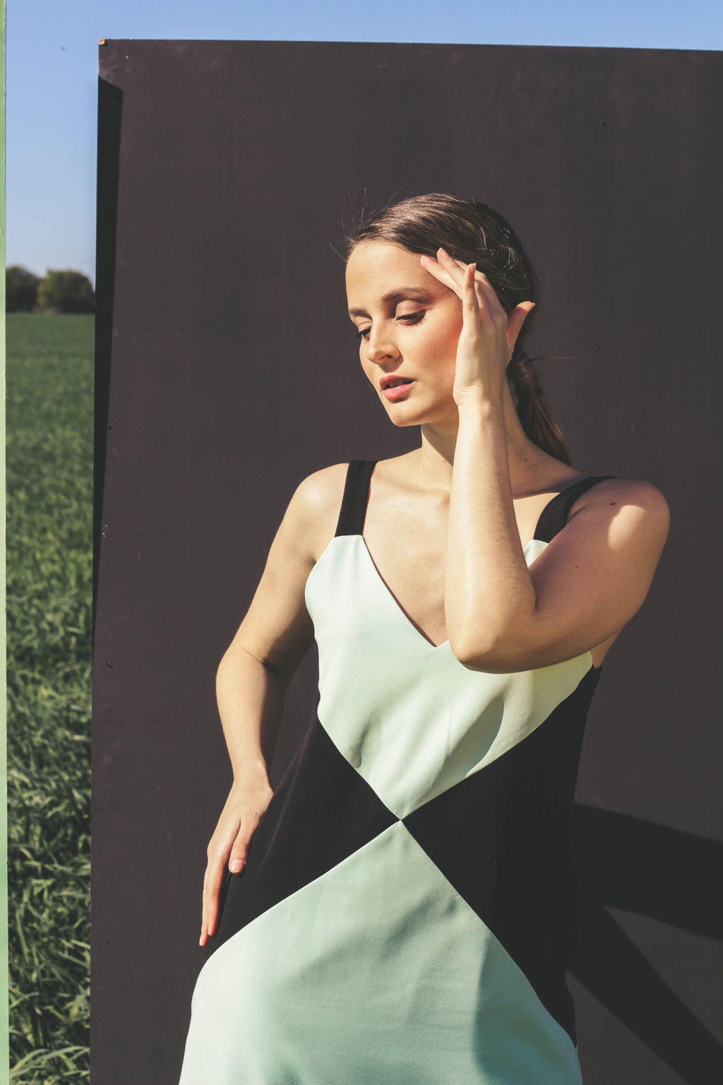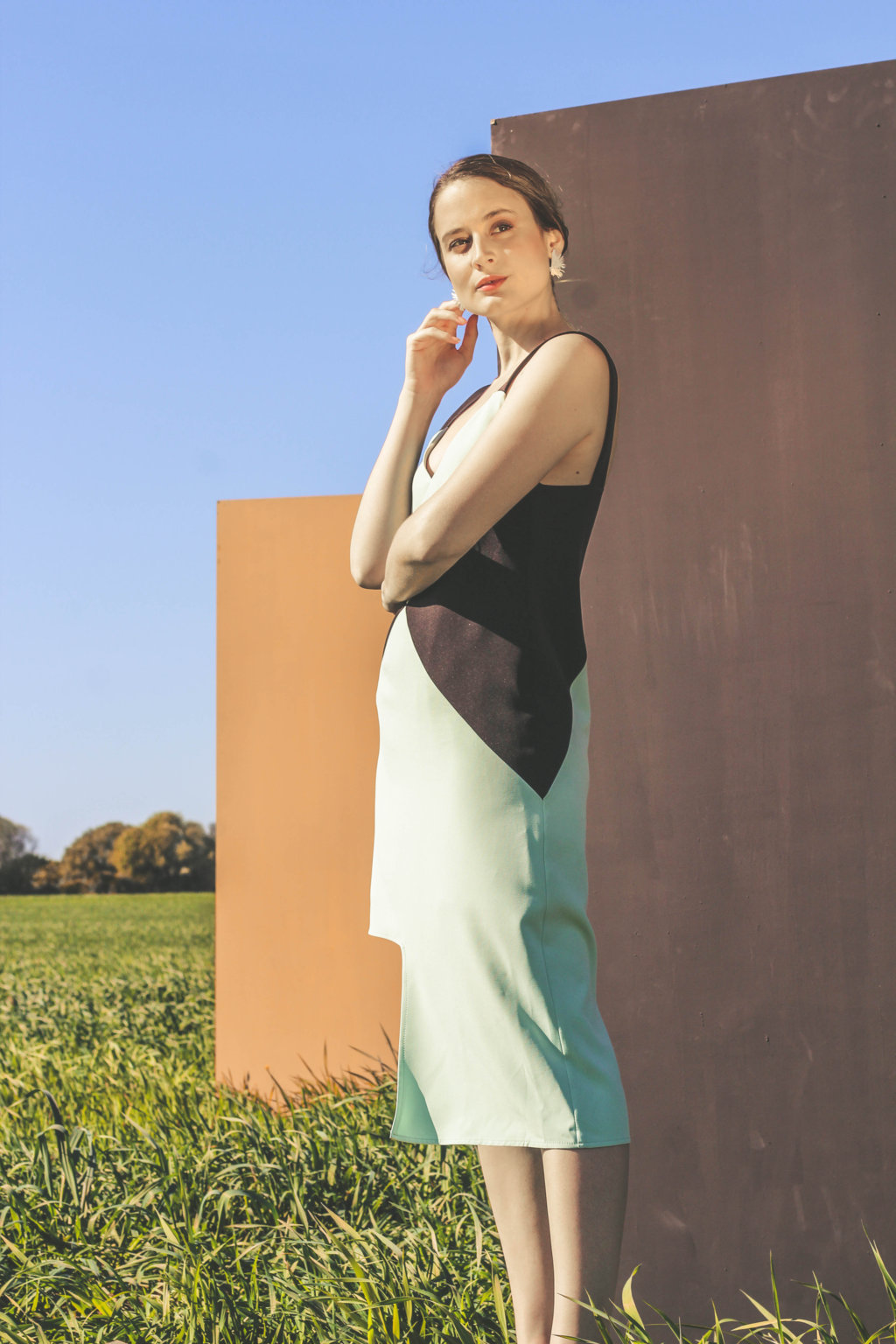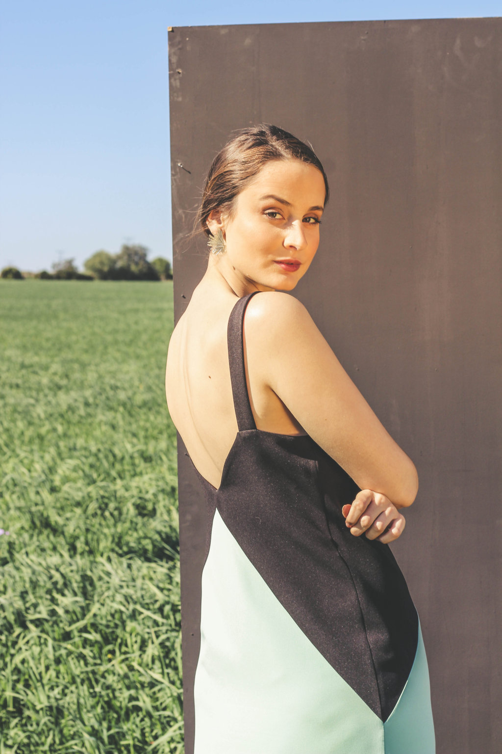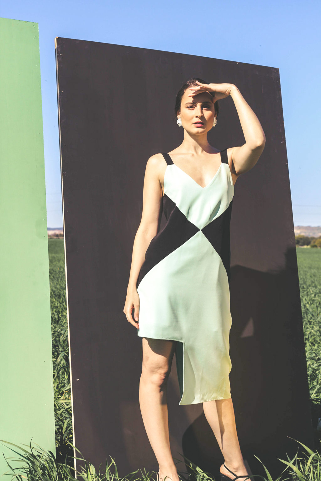 Vestido de corte geométrico y bicolor.