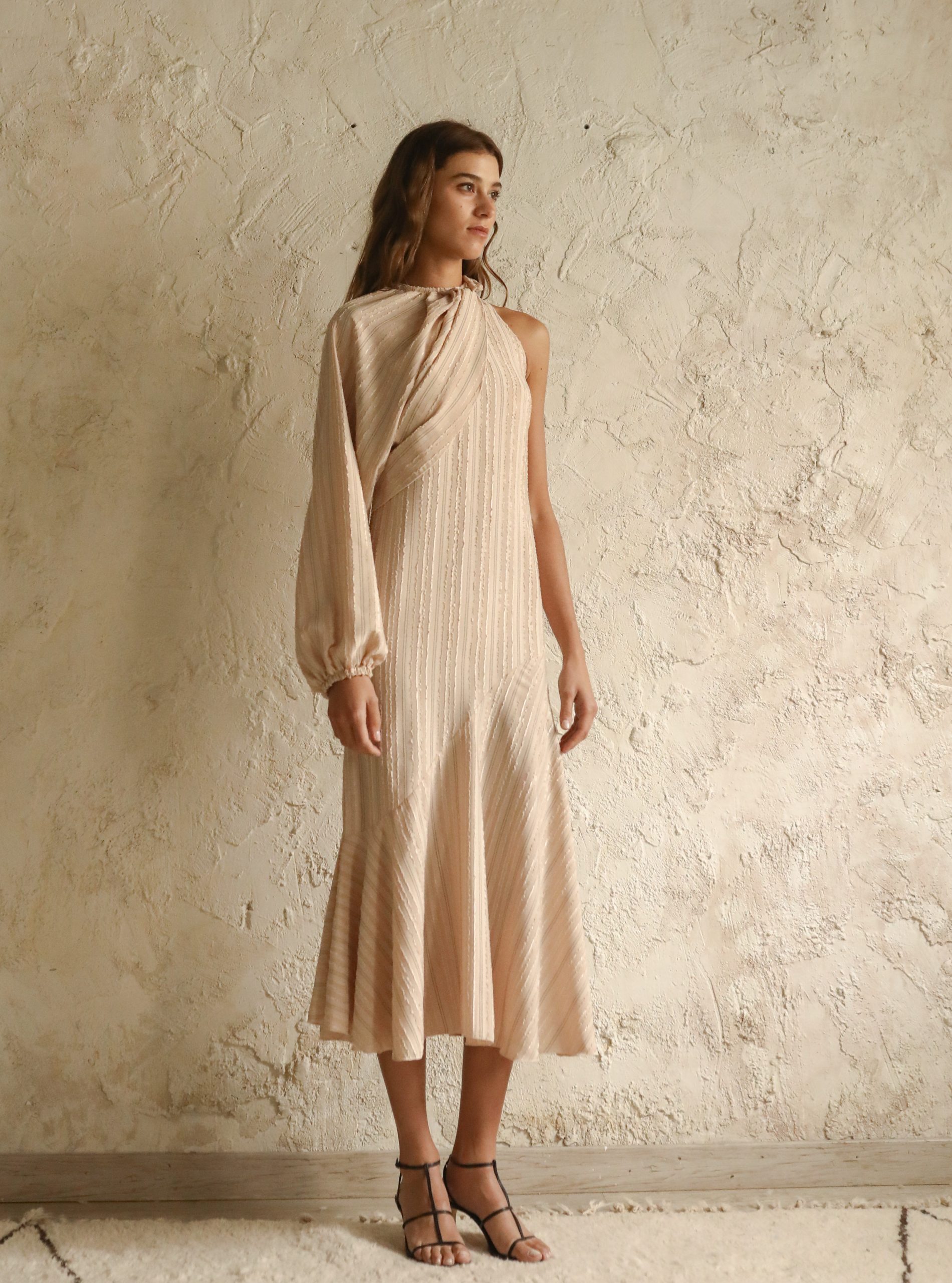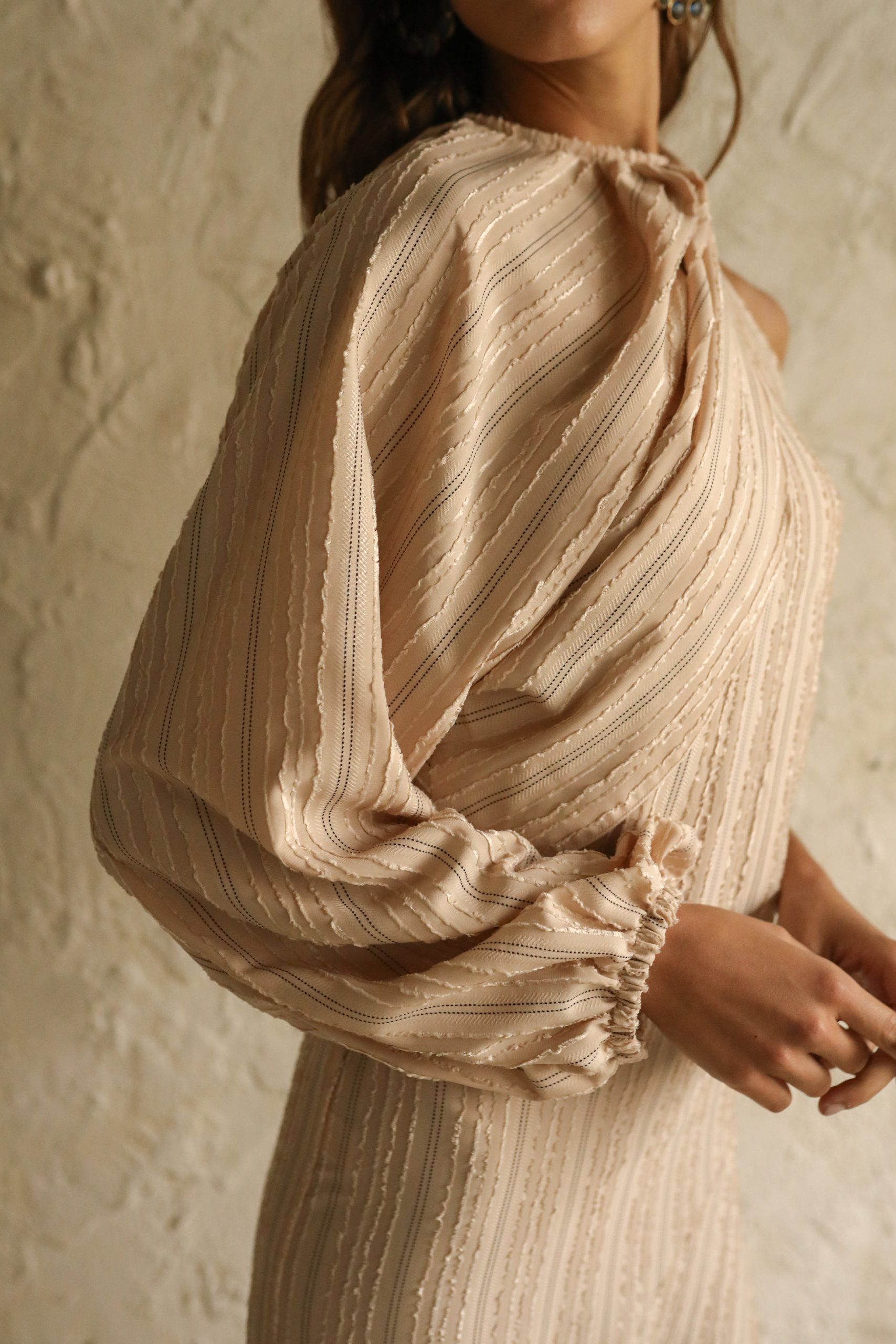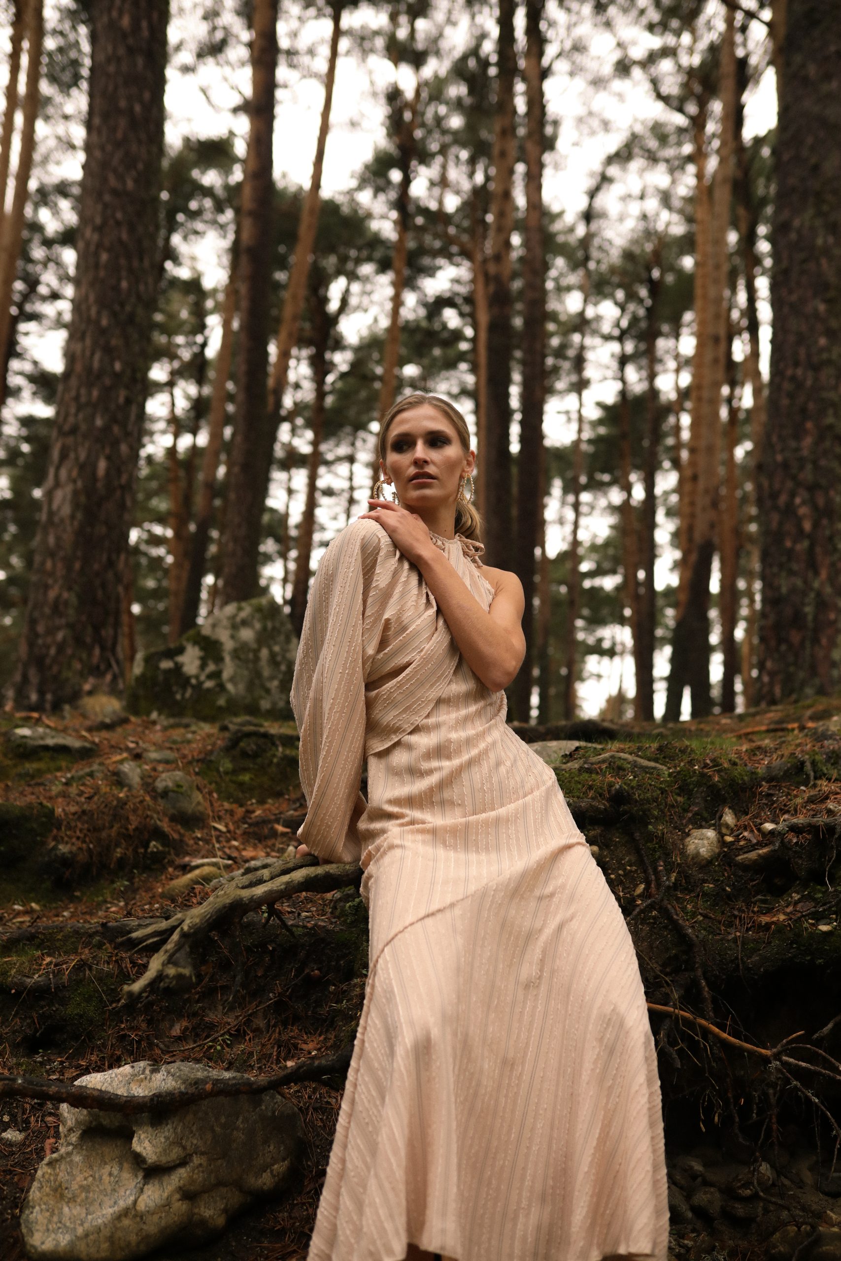 2- Pieza superpuesta, manga drapeada en mismo tejido que el vestido. Puño ajustado con goma.