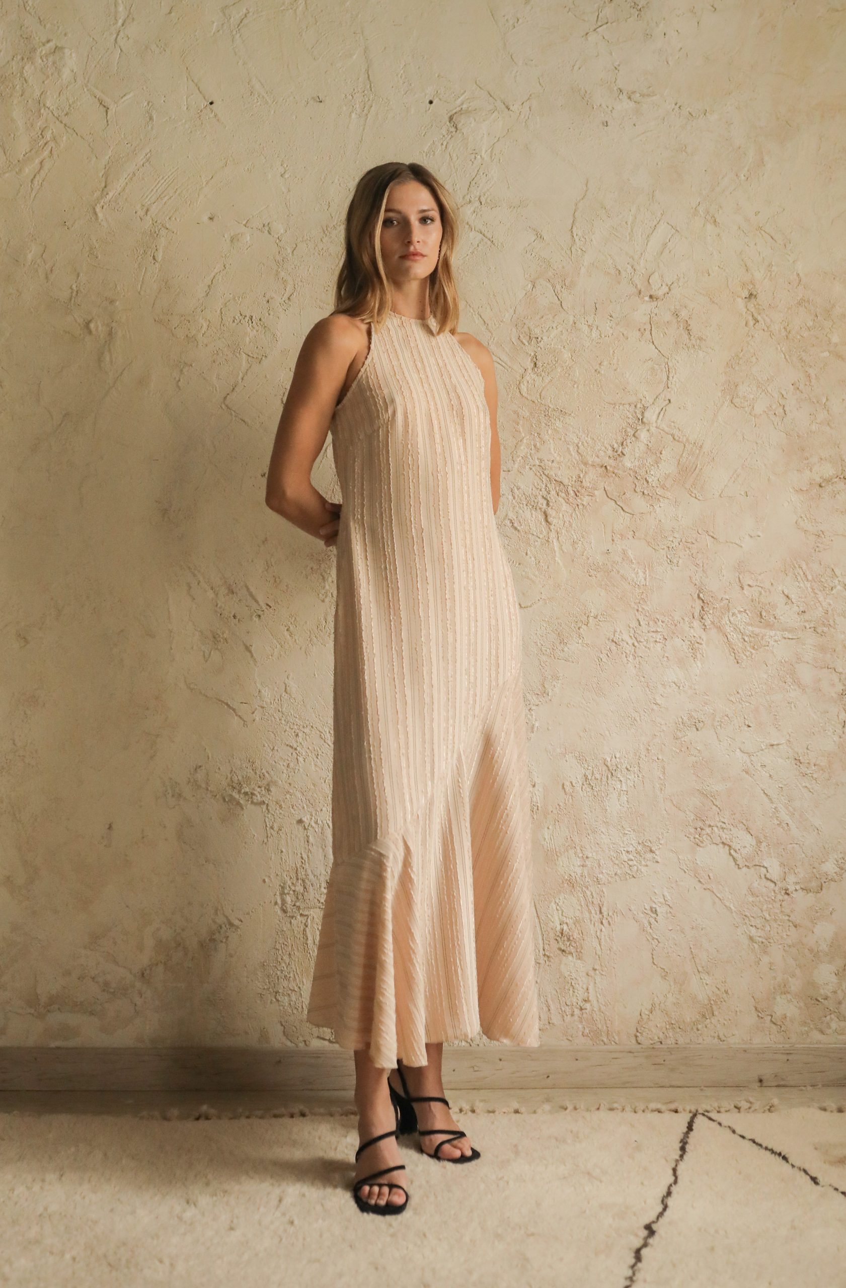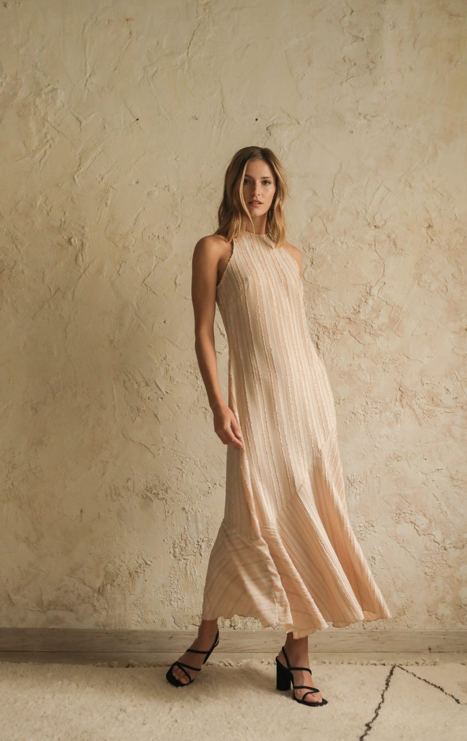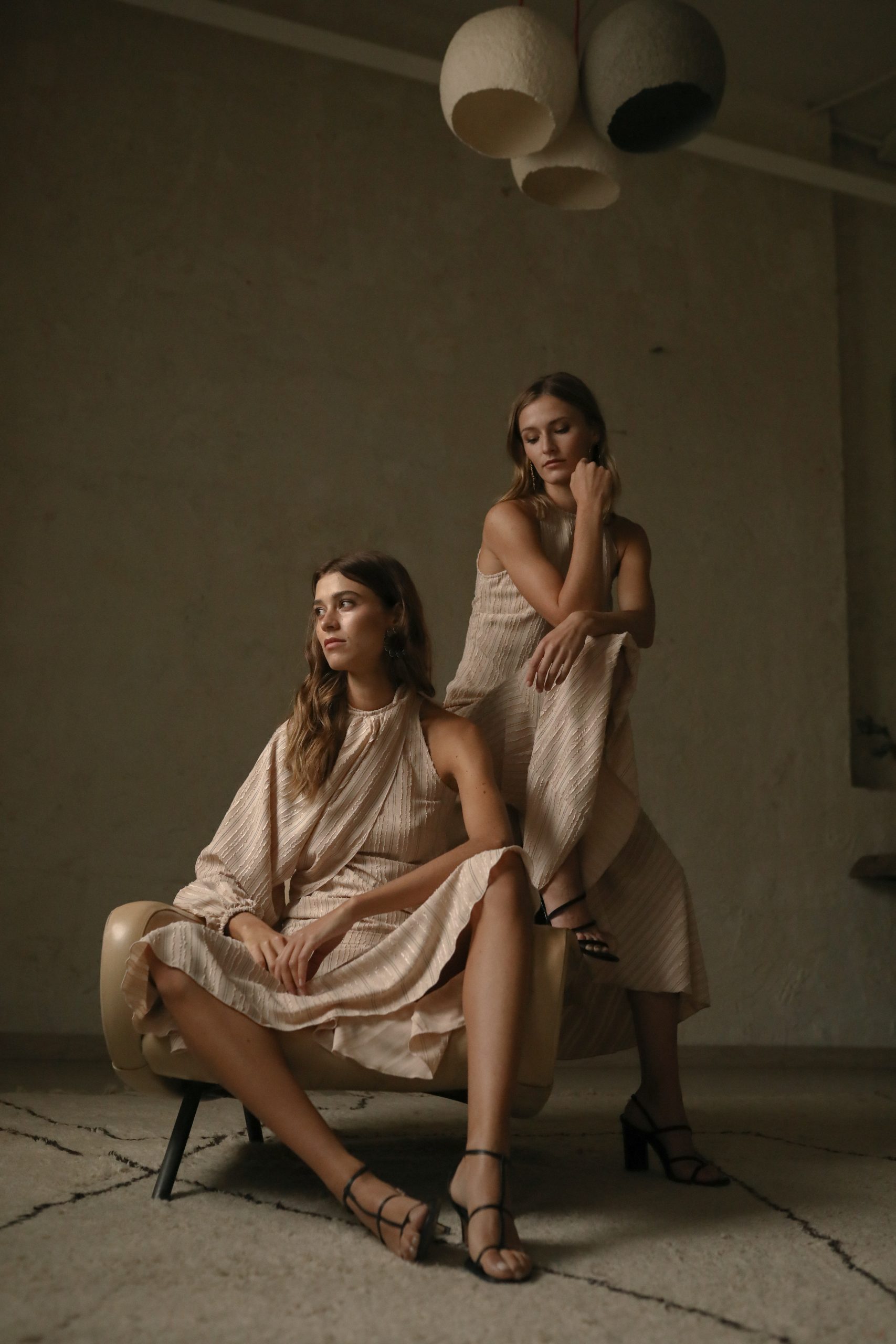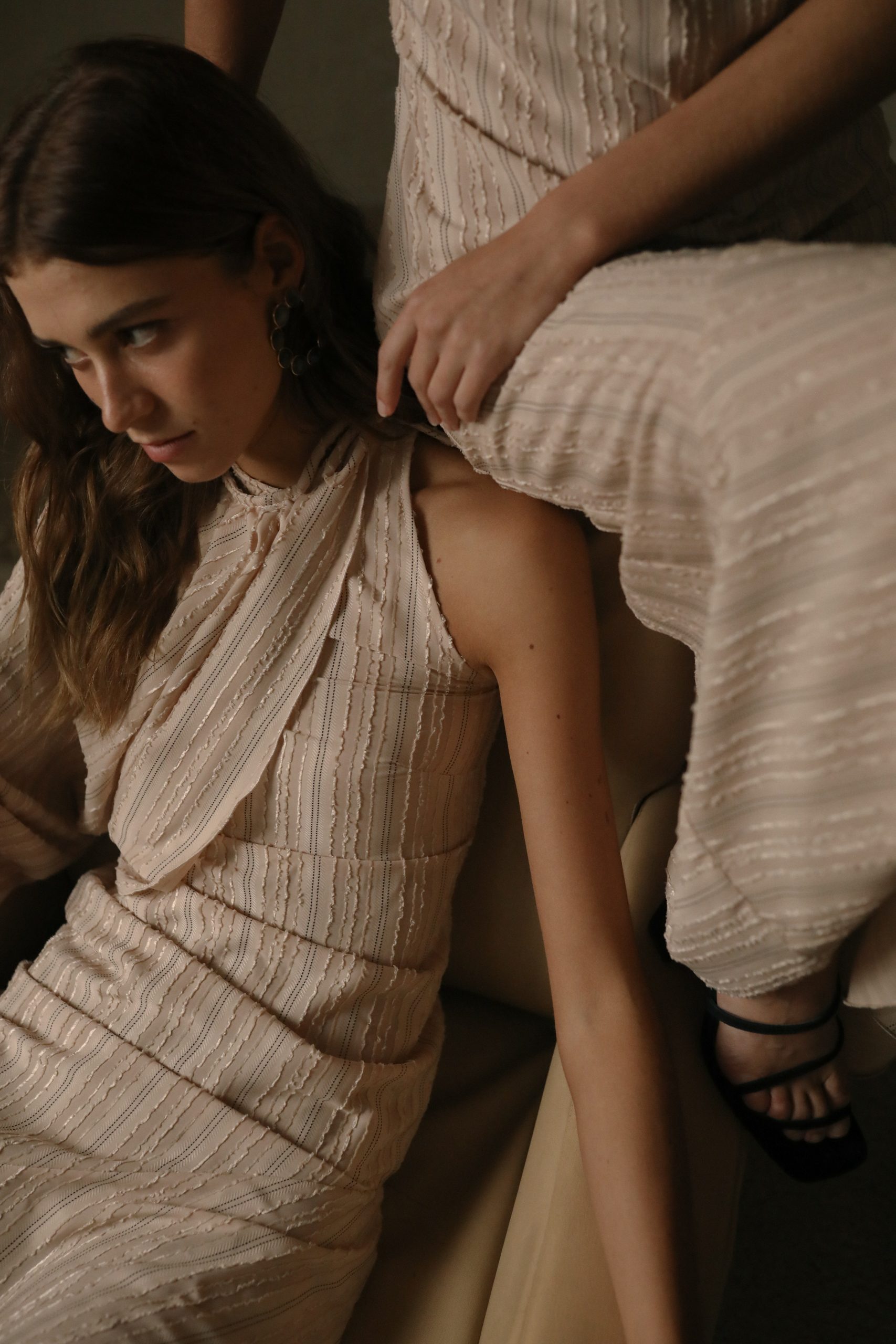 2- Pieza superpuesta, manga drapeada en mismo tejido que el vestido. Puño ajustado con goma.