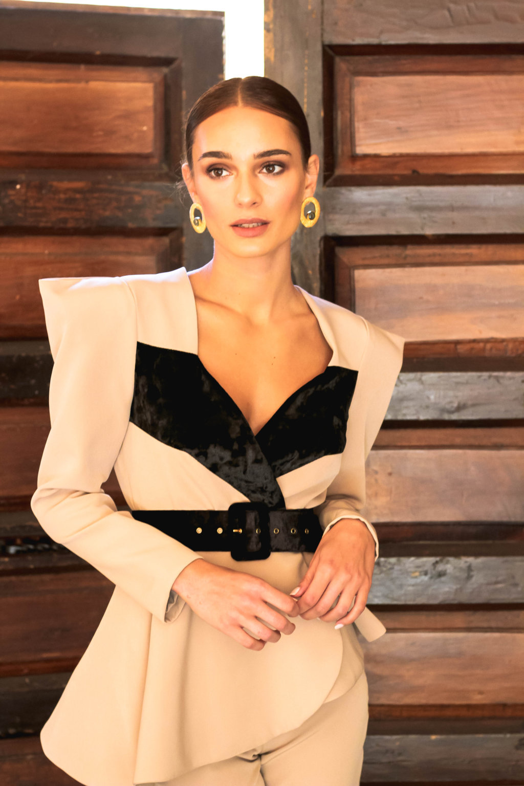 Chaqueta con peplum confeccionada en crêpe elástico. Escote cruzado con mangas abullonada.