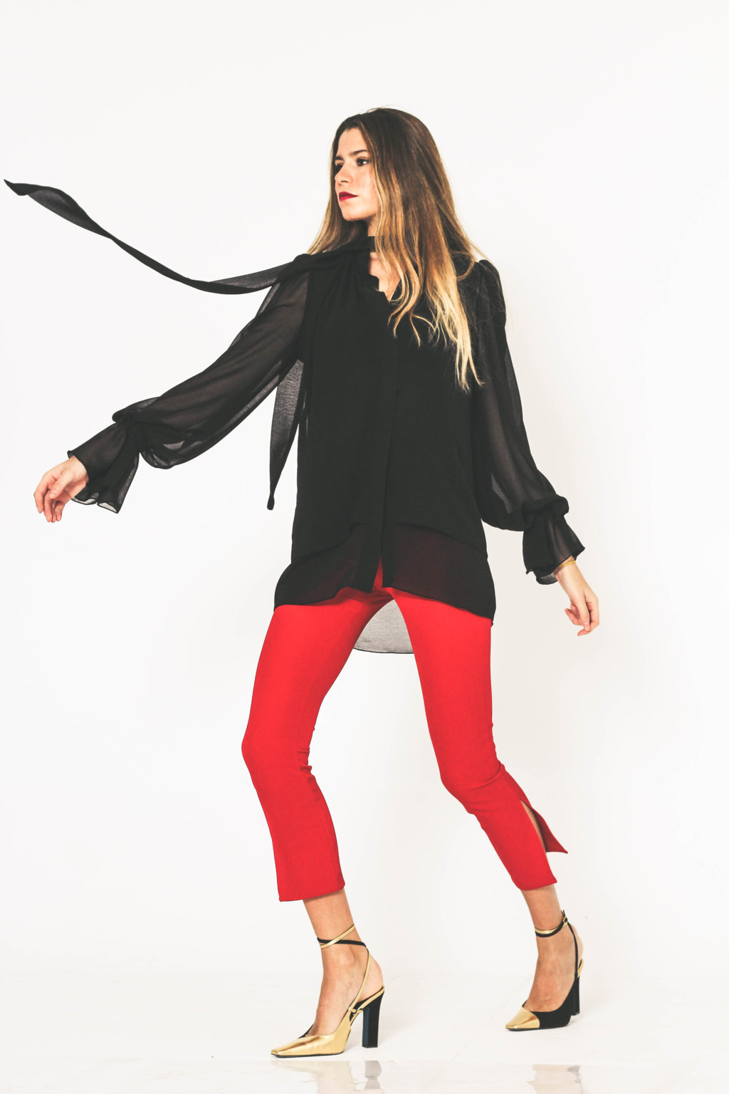 Vestido mini con cuello alto confeccionado en crêpe elástico. Manga larga con frunce en el hombro. Corte en cintura para realzar la figura femenina . Abertura trasera que deja ver las piernas. Cremallera invisible trasera. Lleva cinturón con hebilla cuadrada.