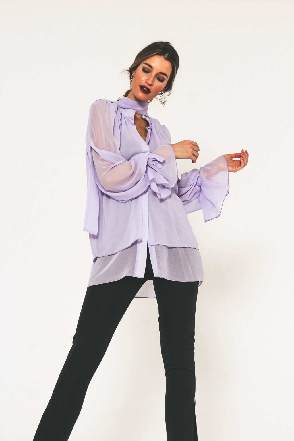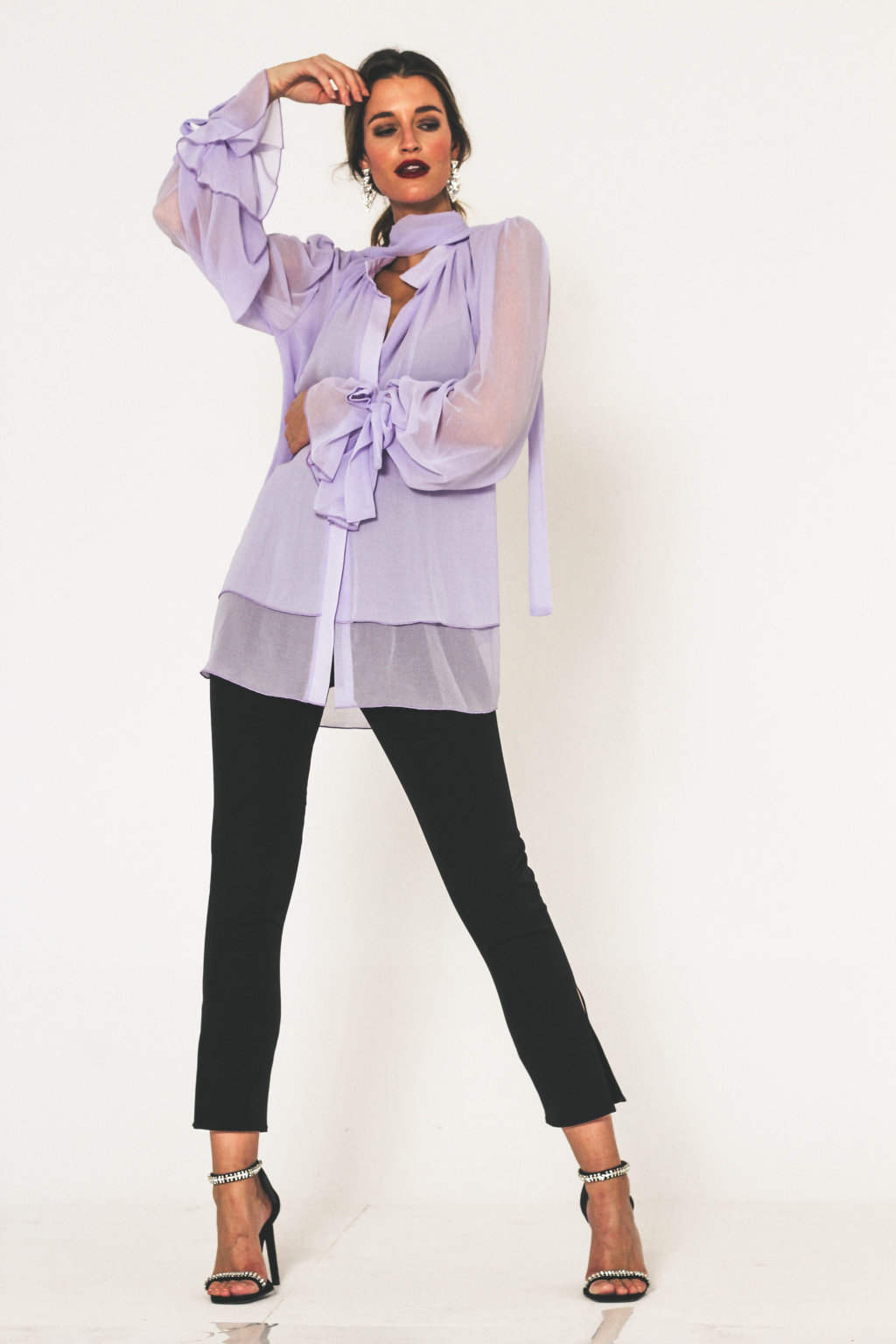 Pantalón pitillo de talle alto confeccionado en crêpe elástico. Cinturilla delantera con detalle en V. Abertura en los bajos laterales Cremallera invisible lateral.