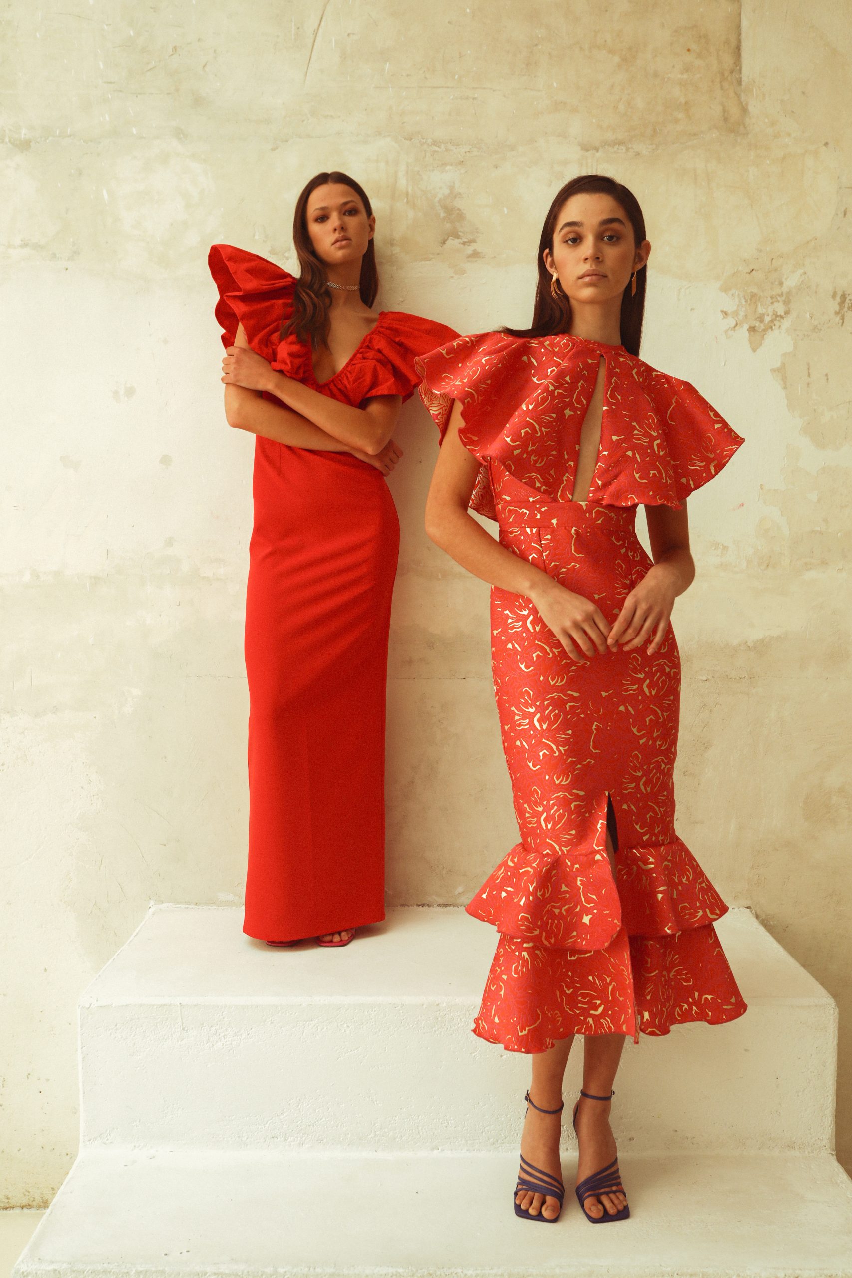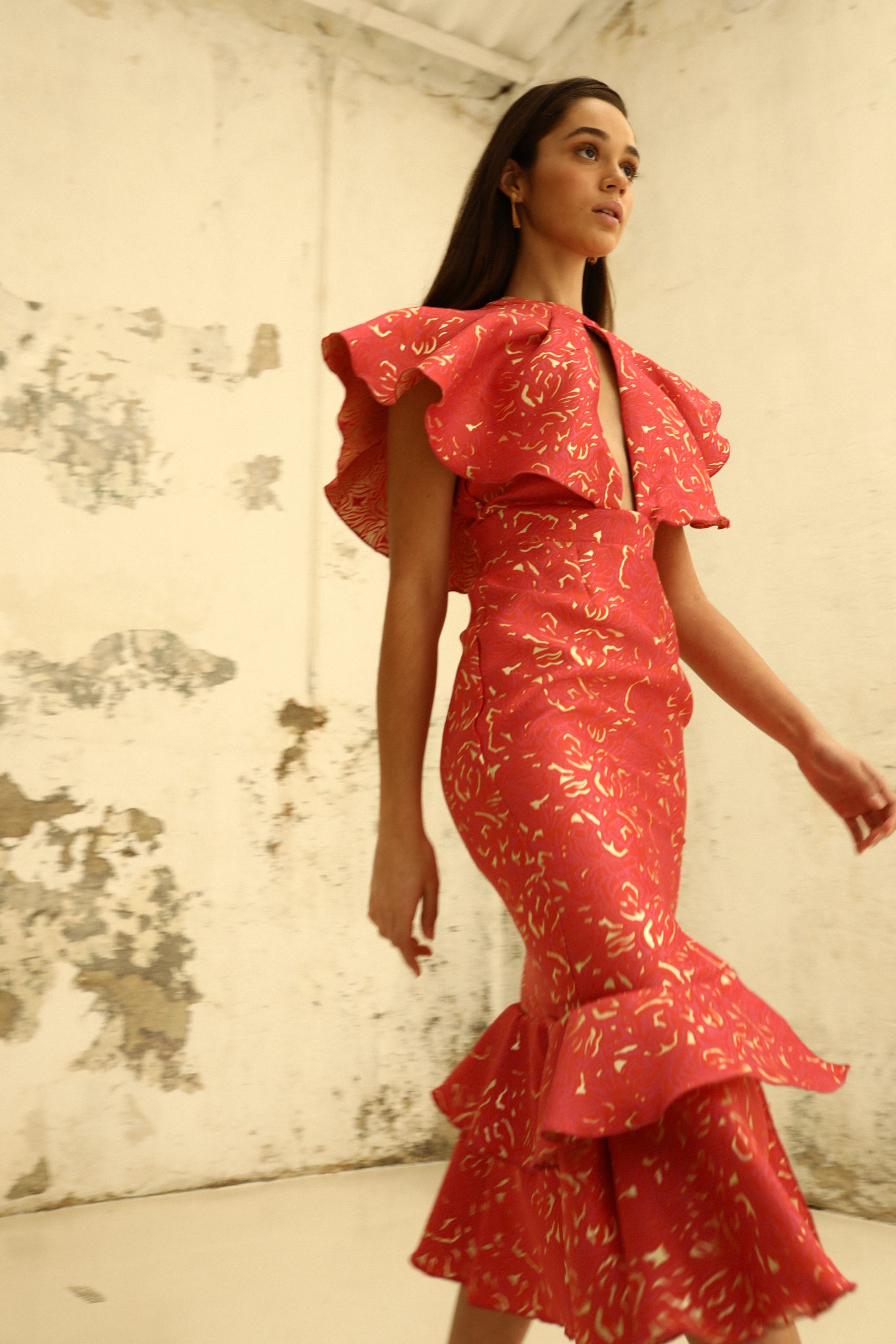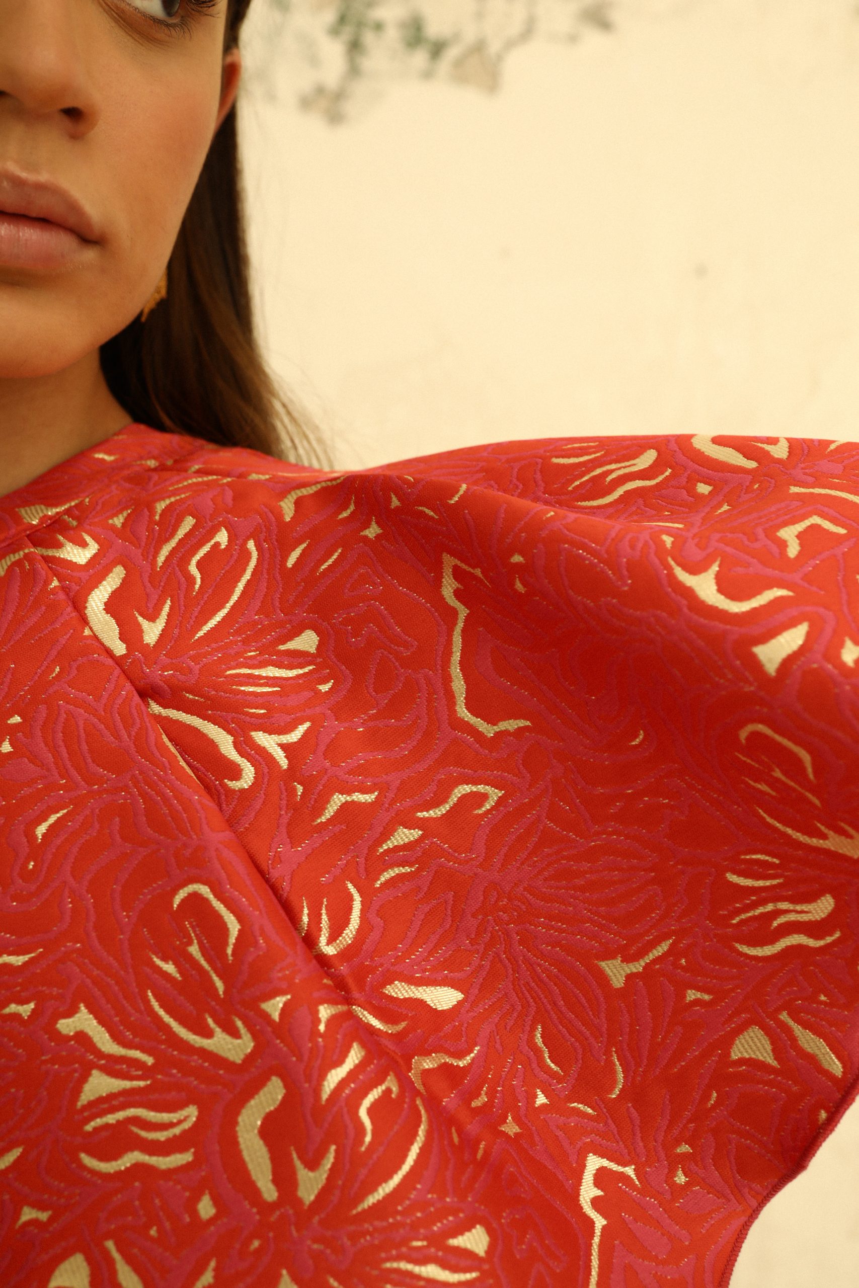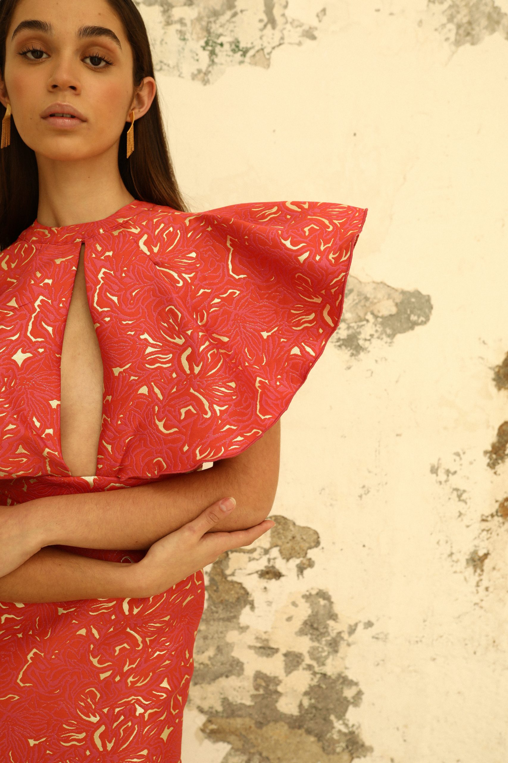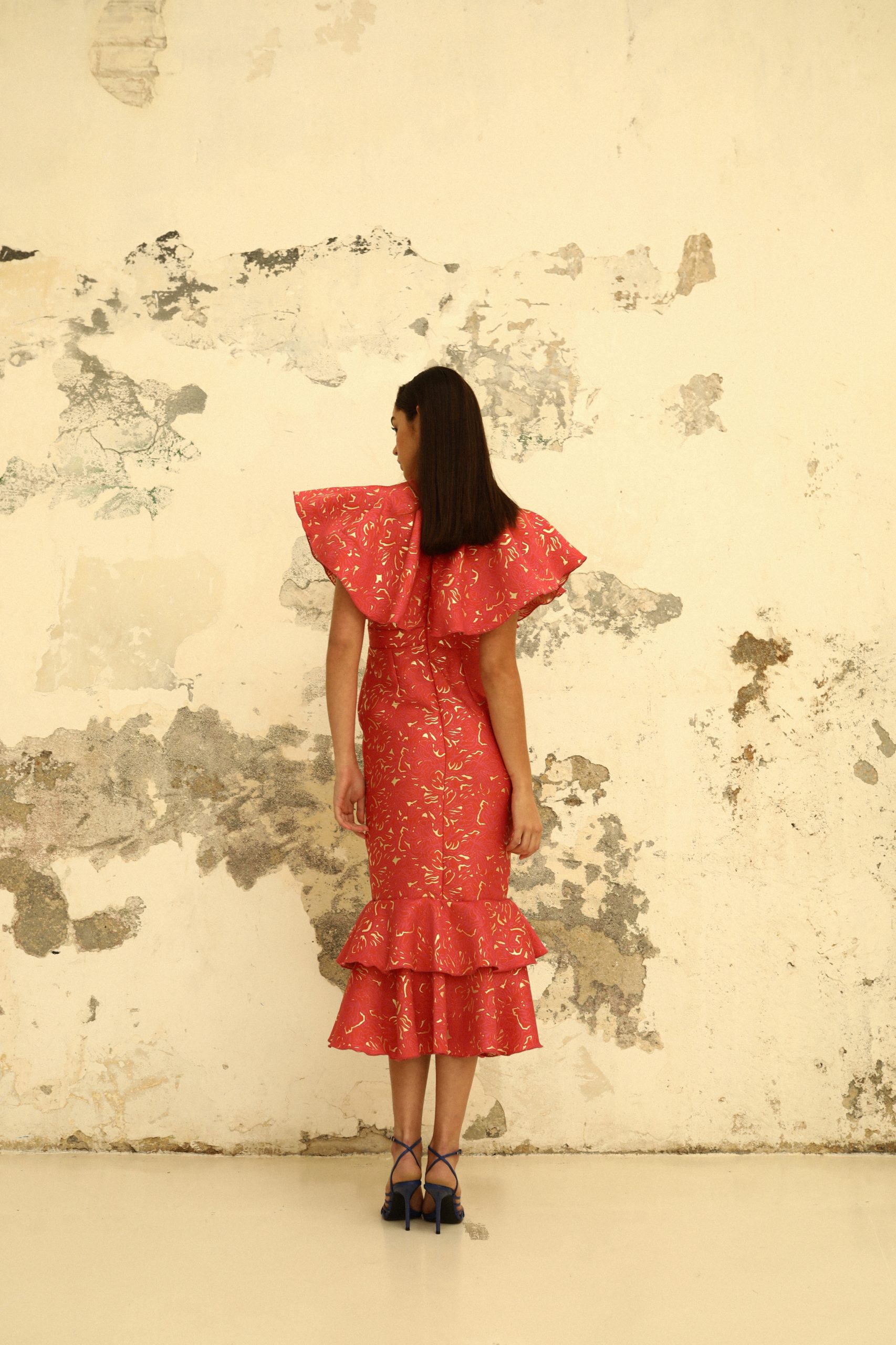 Cuerpo formado por un volante- capa con abertura en el centro del escote y cuello caja.