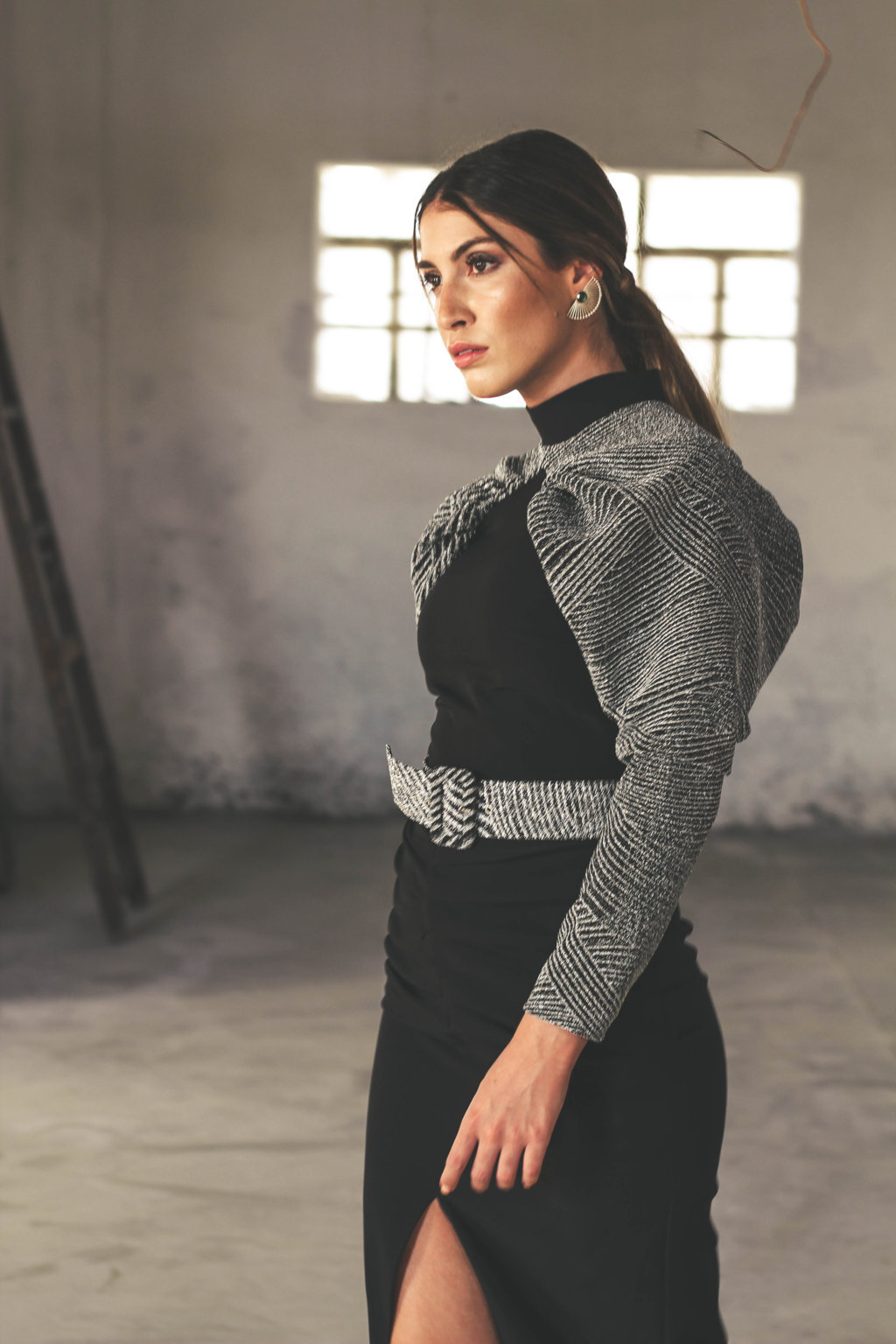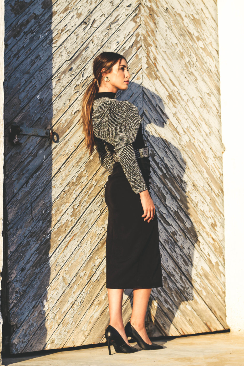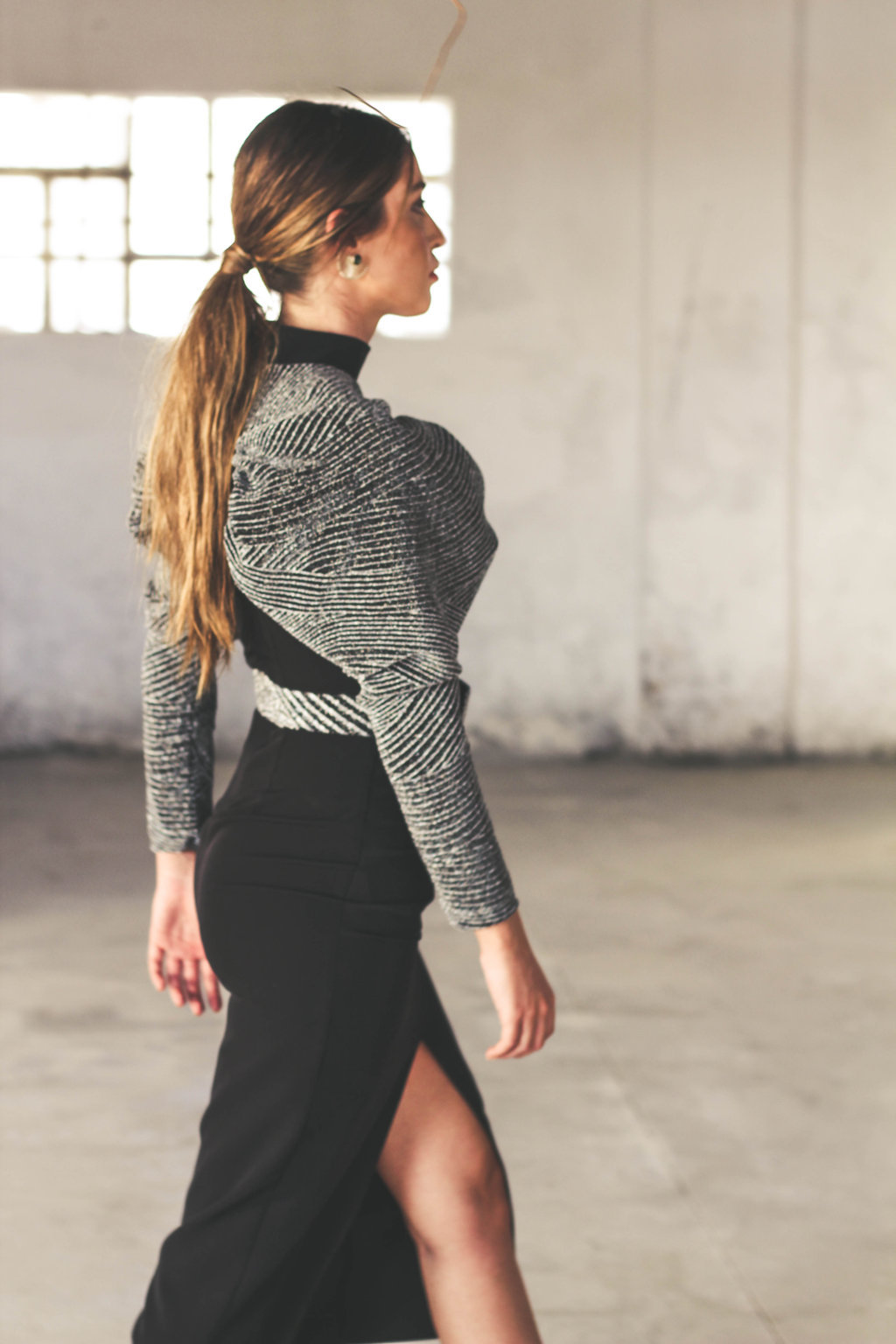 Vestido midi con mangas largas abullonadas y cuello alto confeccionado en crêpe elástico.