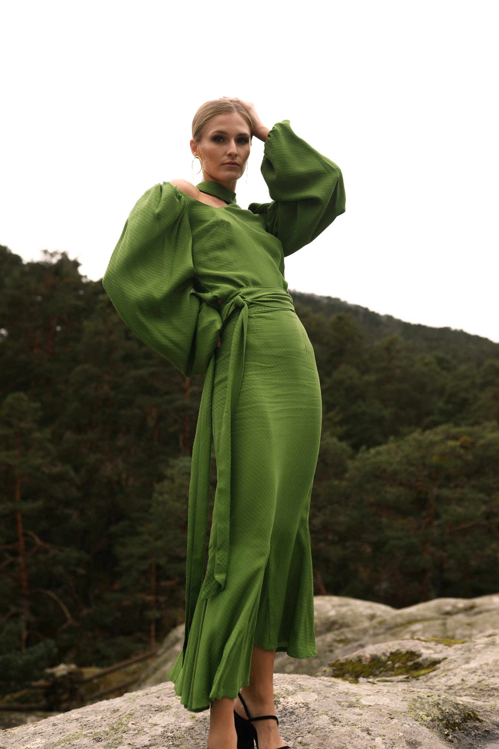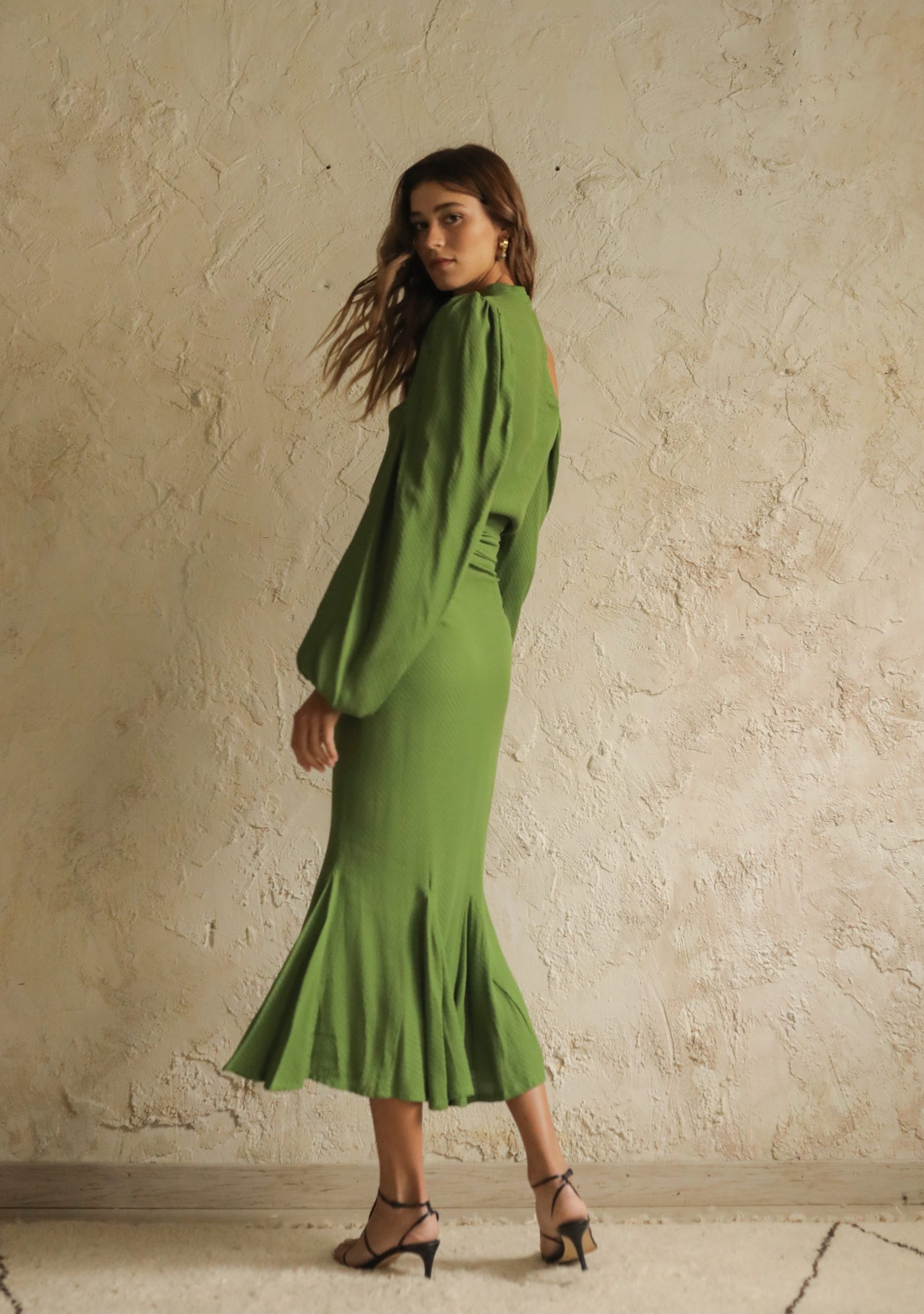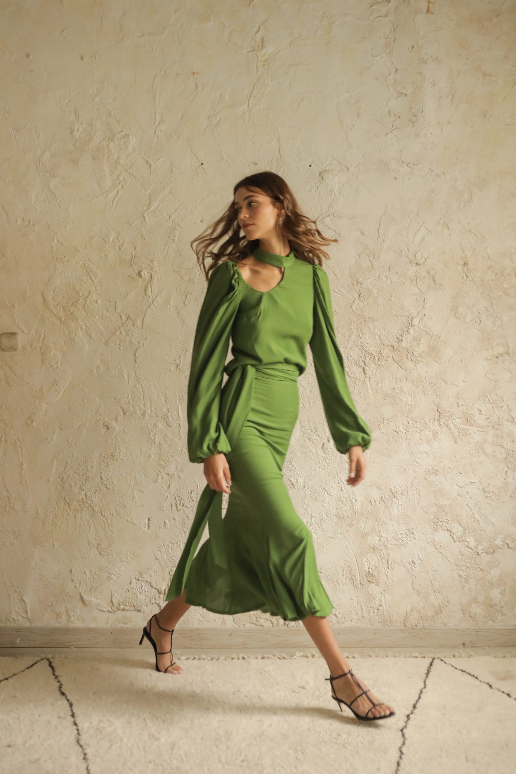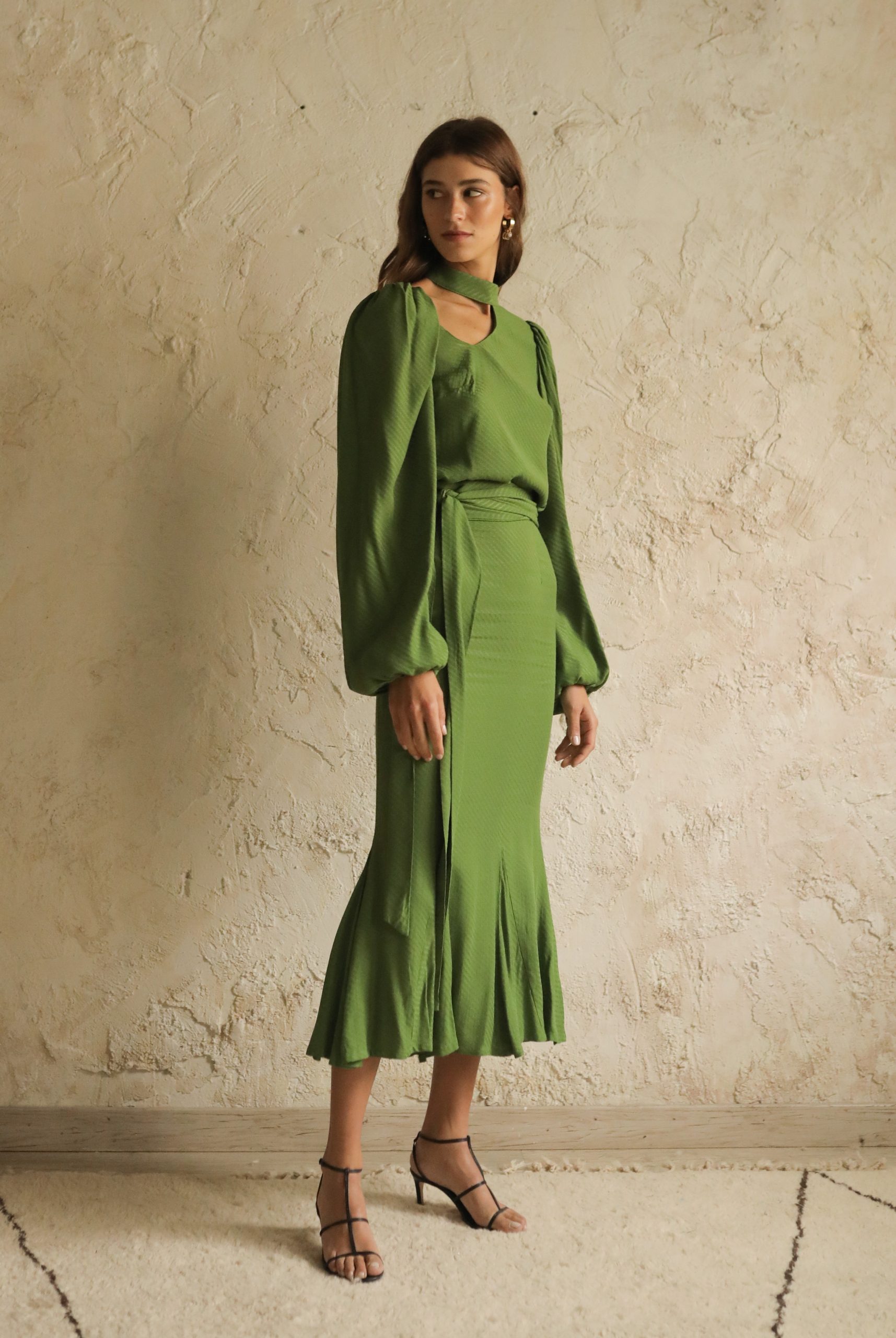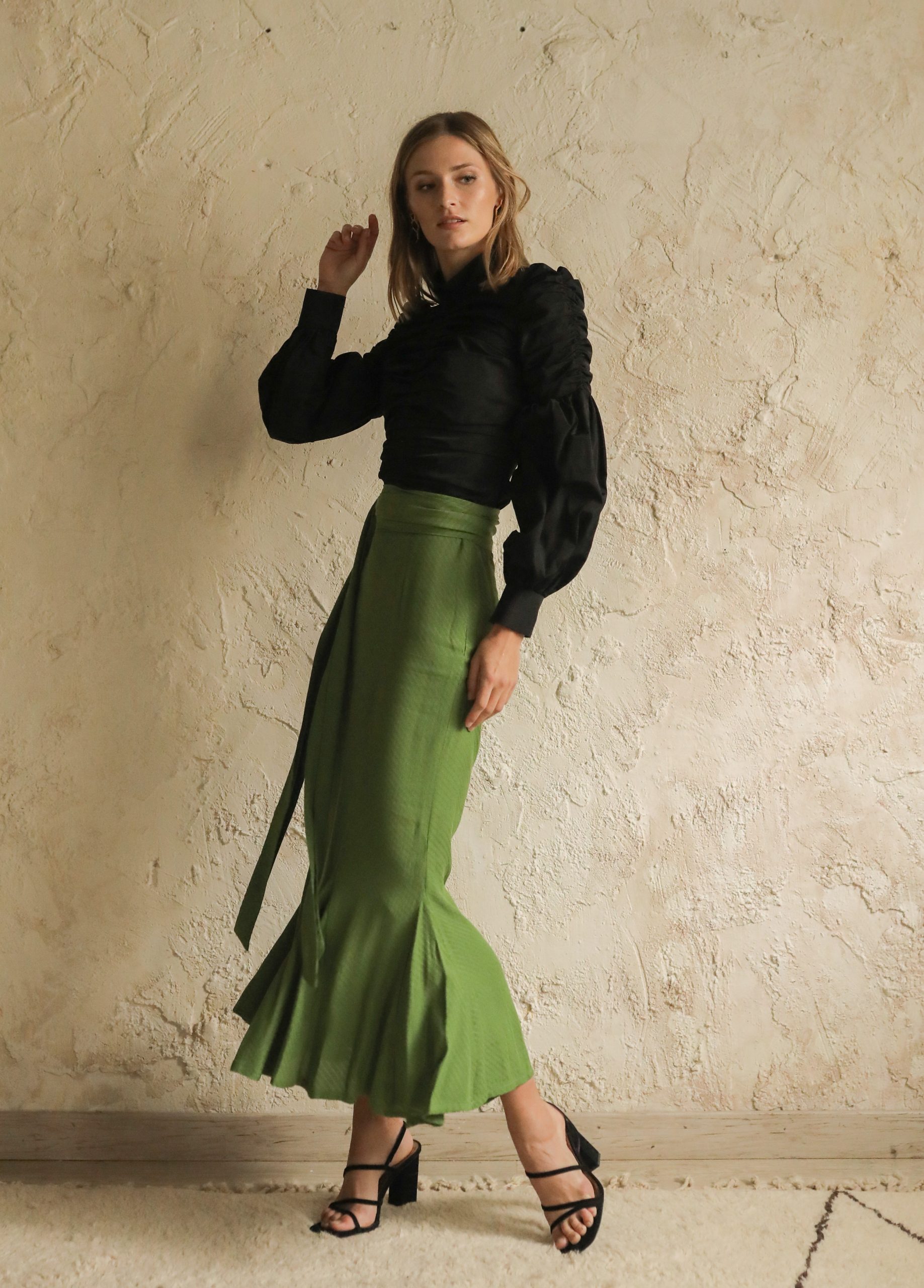 Falda tobillera con vuelo en el bajo. Semi ajustada en cadera. Confeccionado en tejido blusero. Cremallera invisible en espalda. Lazo en cinturilla.