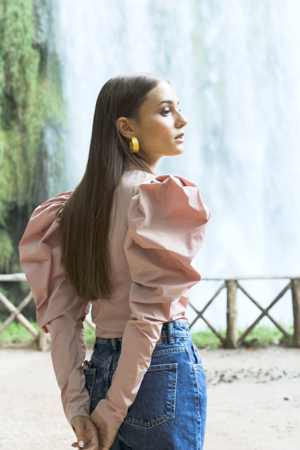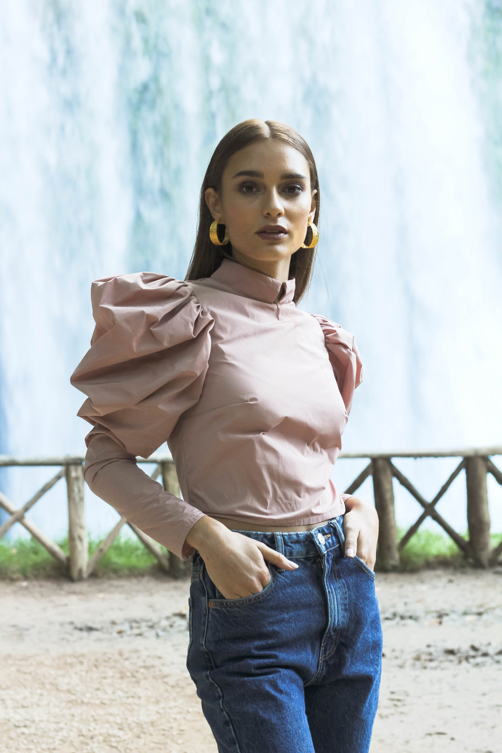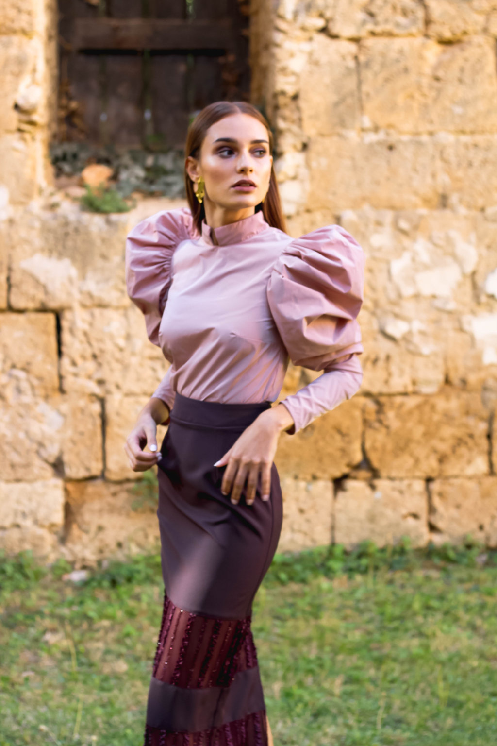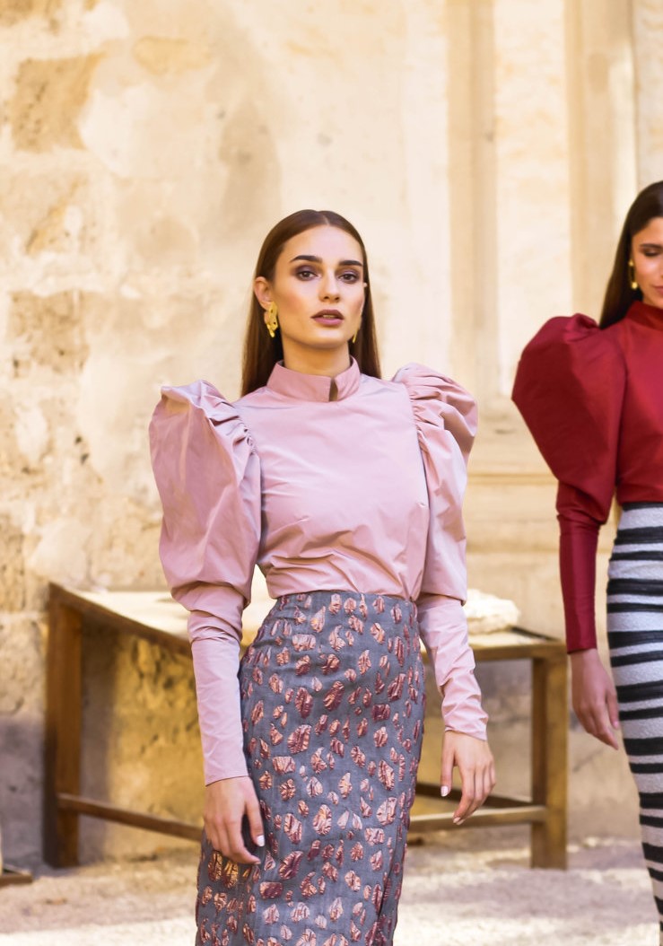 Vestido largo con cuello alto confeccionado en crêpe elástico. Manga larga con frunce en el hombro. Corte en cintura para realzar la figura femenina . Aberturas frontales que dejan ver las piernas. Cremallera invisible trasera. Lleva cinturón con hebilla cuadrada.