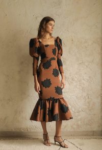 168.00€Vestido confeccionado en tejido jacquard. Escote abierto cuadrado en delantero y espalda. Mangas largas y abullonadas en hombros. Volante fruncido en bajo. Cremallera invisible en lateral.