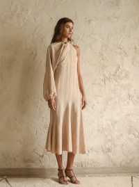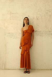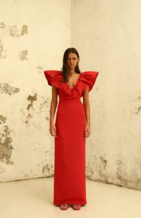 210.00€Vestido largo confeccionado en crepe con caída. Escote asimétrico con nudo central del que sale una manga volante. La falda de corte recto lleva dos volantes colocados en forma de v. Cremallera trasera invisible.