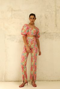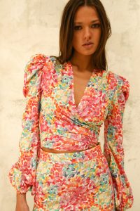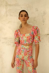 93.50€Top estampado de escote cuadrado en delantero y espalda. Mangas abullonadas al codo y cremallera invisible en costado.