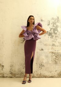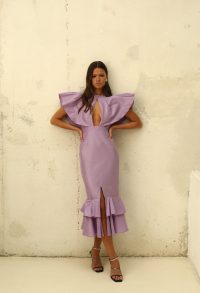 178.50€Vestido corte midi, confeccionado en tejido tafetán lila. Cuerpo formado por un volante – capa con abertura en el centro del escote y cuello caja. Falda tubo rematada en el bajo por dos volantes con abertura delantera. Cremallera trasera invisible.
