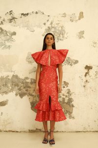 178.50€Vestido corte midi, confeccionado en tejido jacquar. Cuerpo formado por un volante- capa con abertura en el centro del escote y cuello caja. Falda tubo rematada en el bajo por dos volantes con abertura delantera. Cremallera trasera invisible.